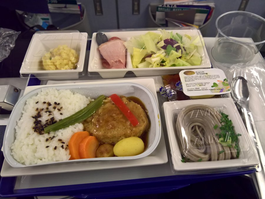 Vi vuxna kunde därför äta som vanligt när maten kom. Först kom snacks och drinkar, där jag drack kabosu-juice (kabosu är en citrusfrukt) som smakade friskt och gott. Lite senare kom middag, där det fanns två val. Både jag och frun tog den japanska varianten som var ris, typ pannbiff, nudlar, grönsaker och potatissallad. Det smakade bra och sköljdes ner med mer av kabosu-juicen. Efter maten fick vi vaniljglass med jordgubbssylt.