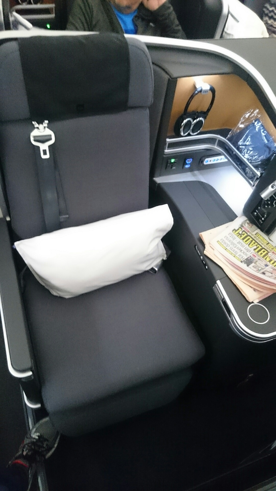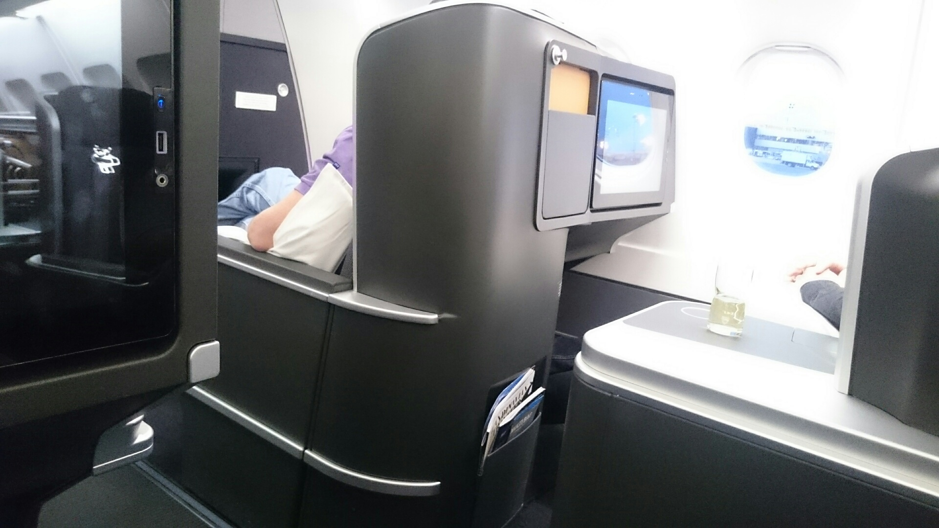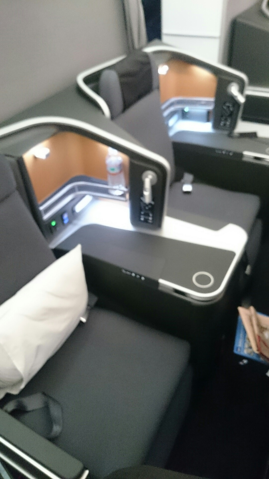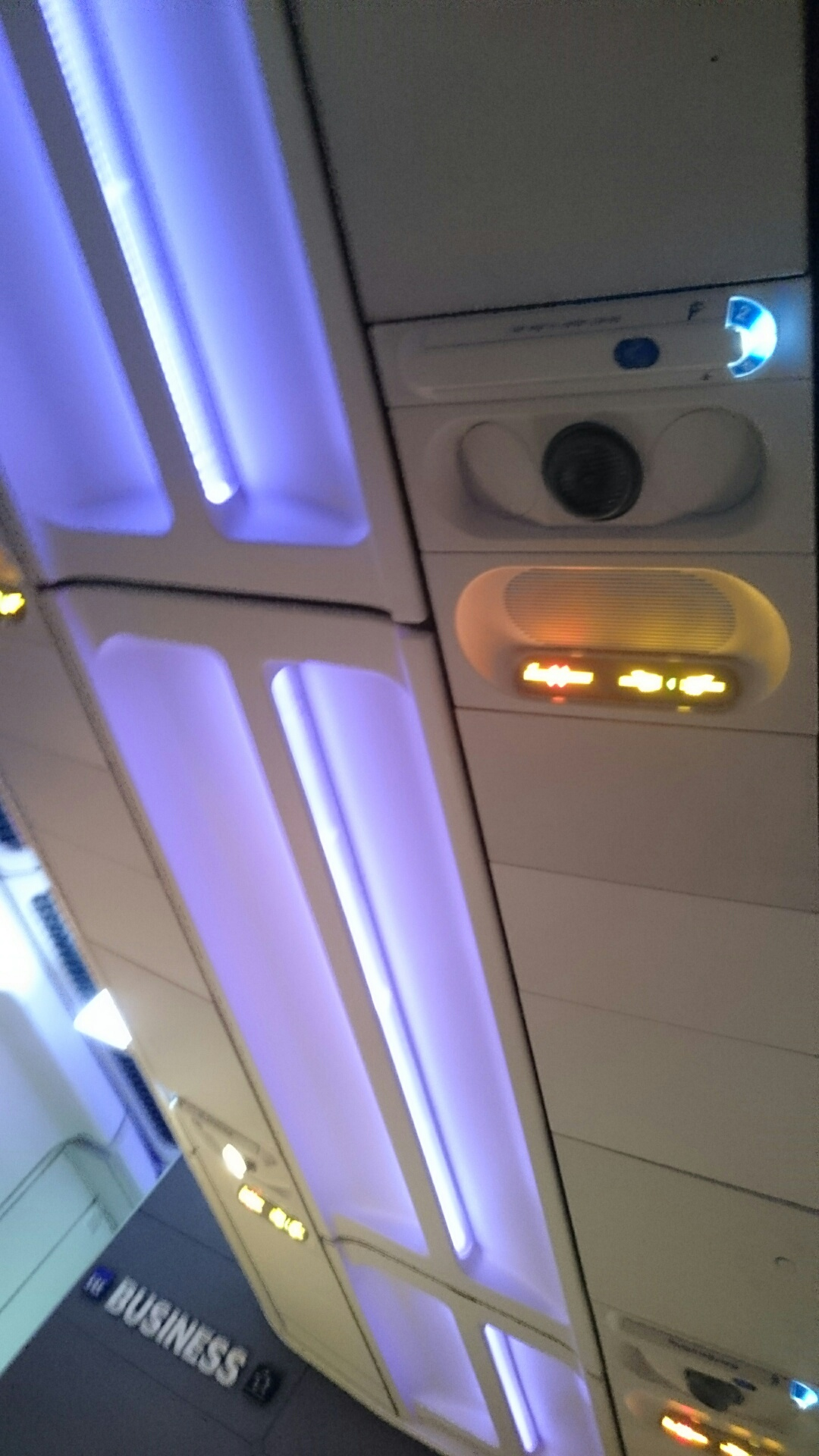 Kabinen känns sober men fräsch, men nästan så man upplever det lite trångt trots 1-2-1 config då stolarna i sig tar en hel del plats. Stolarna är bekväma och man har gott om plats att förvara ipad, telefon, hörlurar etc.