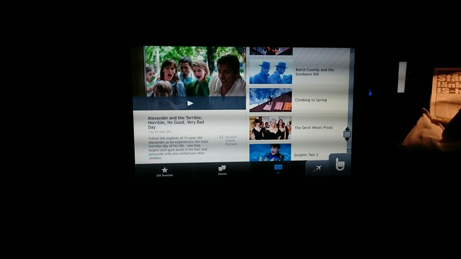 Under maten drar jag igång IFE som till en början ser riktigt bra ut, man kan styra med bade fjärrkontroll och touch, dock när jag sätter igång några filmer så är de i ganska låg upplösning och dessutom i 4:3-format istället för 16:9 som skärmen är i.Antar filmerna kommer att anpassas med tiden, vore ju synd att inte untyttja skärmarna till fullo. Testar några spel och försöker sen få igång kamerorna på planet som inte vill funka så tillbaka till film (blev Ice Age, få tillfällen jag har möjlighet att titta på den typen av film på originalspråk, annars är det ungarna som styr