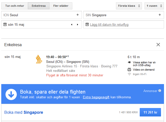 Men på denna sträckan kan man flyga med Singapore Airlines i First class för ett relativt överkomligt pris.
