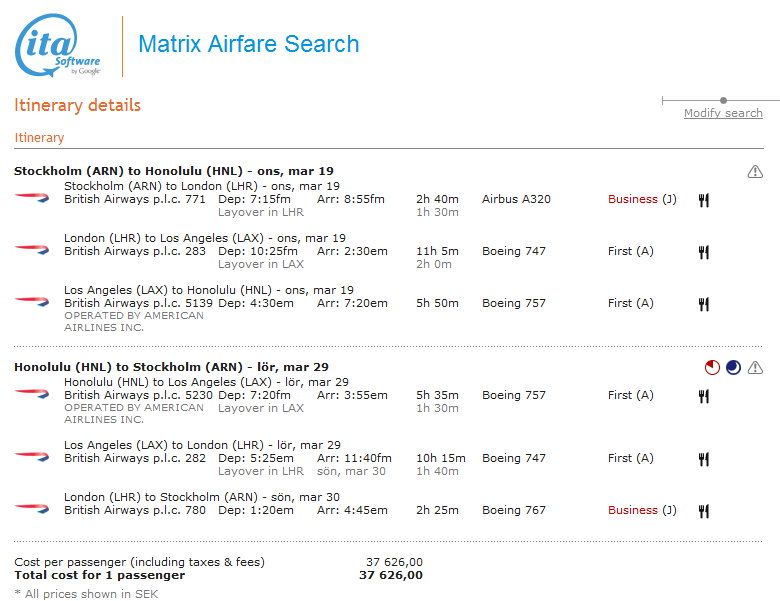 Det kostar mellan 29.300 SEK (Boston) och 37.700 SEK (Hawaii) inkl. skatter beroende på routing.
