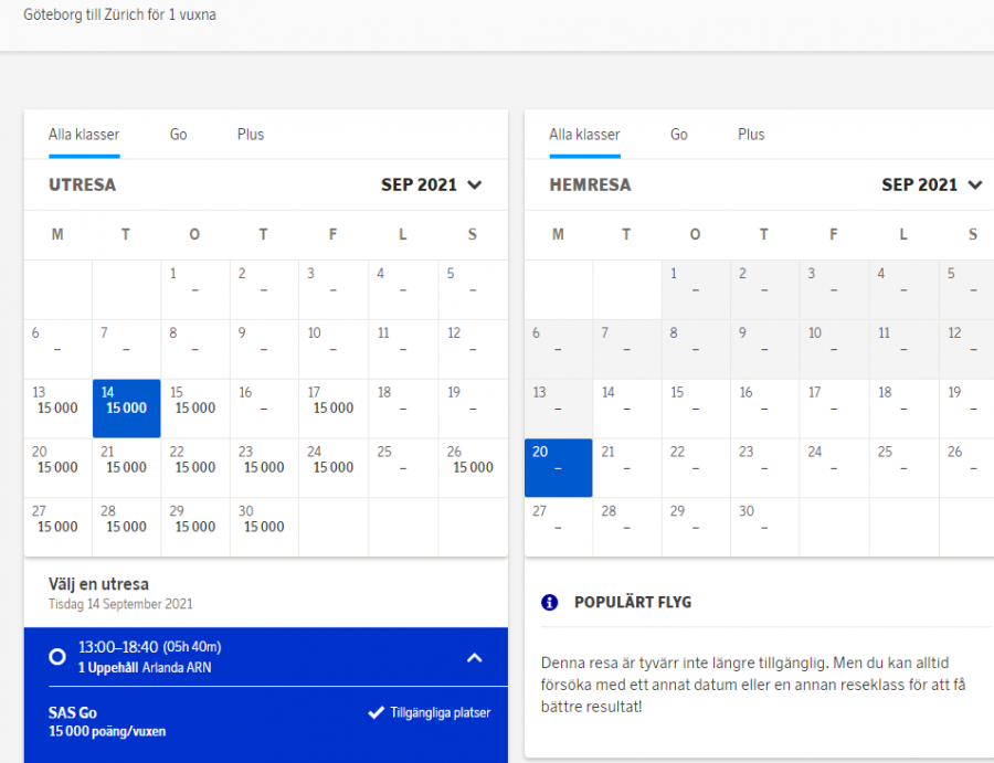 Funkar fint för mig. Fick på hemresan välja "visa ytterligare 10 resor" eller vad det står längst ner.Försöker boka resa till ZRH men är man inloggad finns inga hemresor i september. Försöker jag boka vanlig biljett men väljer att betala med poäng så finns det biljetter från 13/9. Utresa/hemresa i september från GOT. Varit i kontakt med SAS via chatten men ingen fattar eller har någon förklaring utan hänvisar mig till att ringa de och göra bokningen. Någon som har en förklaring förutom SAS IT?