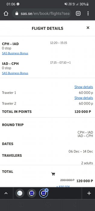 Se bild, stämmer det poäng priset går det att använda amex, 2 for 1 voucher här? Blir det då halva 120k poäng plus skatter?