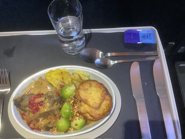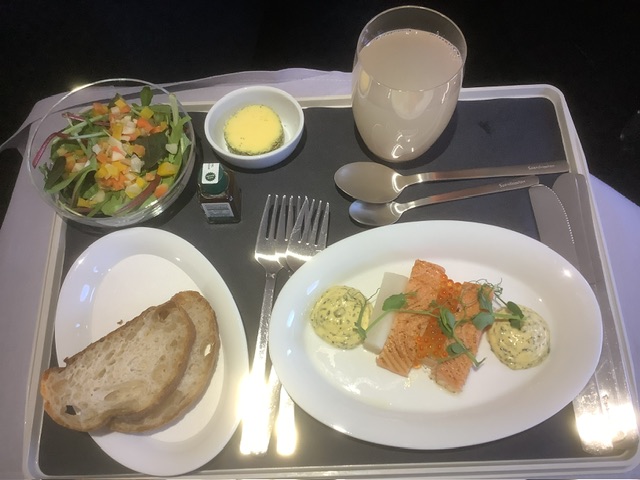 Först lax som smakade som lax på sushi, valde mellan pasta och kött, det blev tyvärr segt kött torr potatisgratäng.