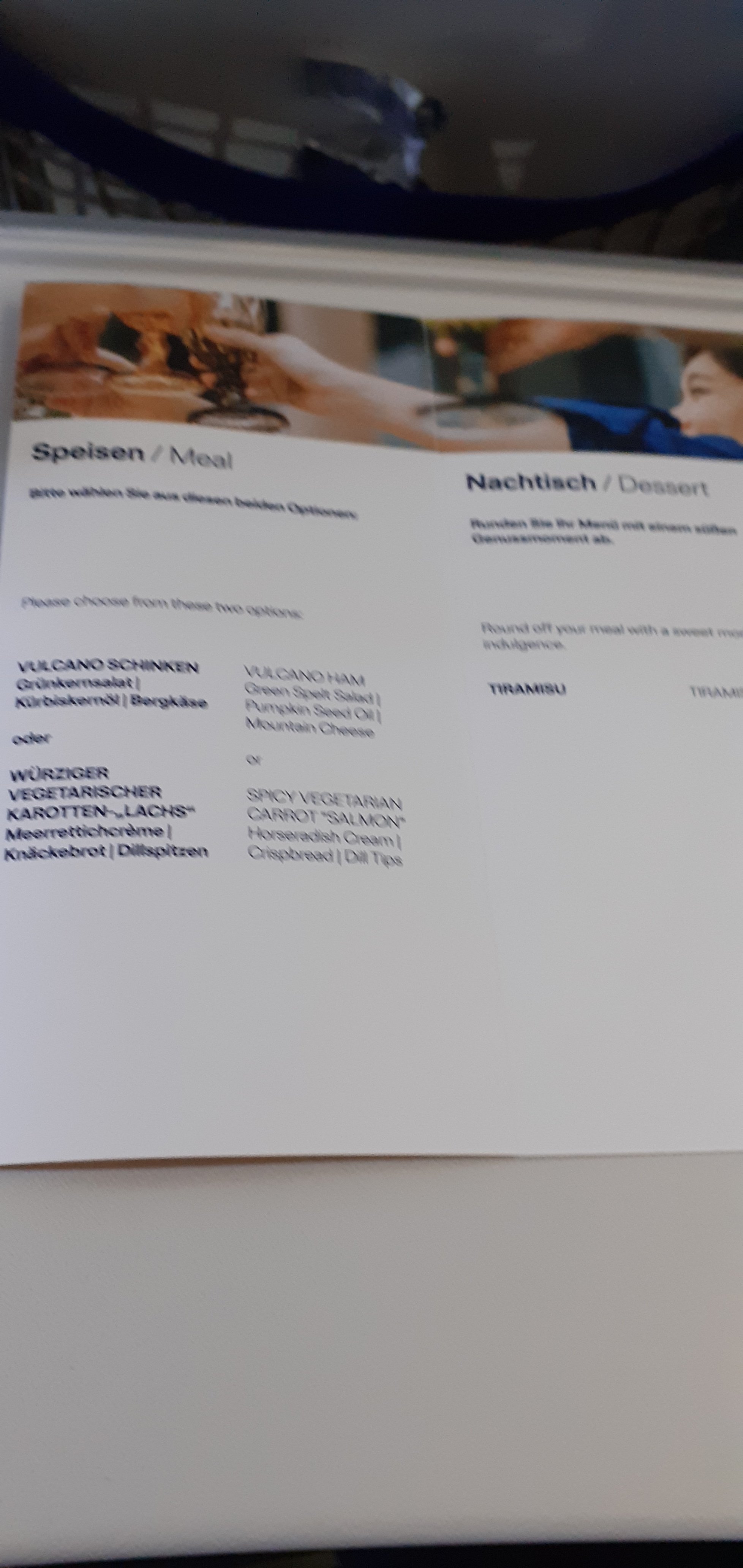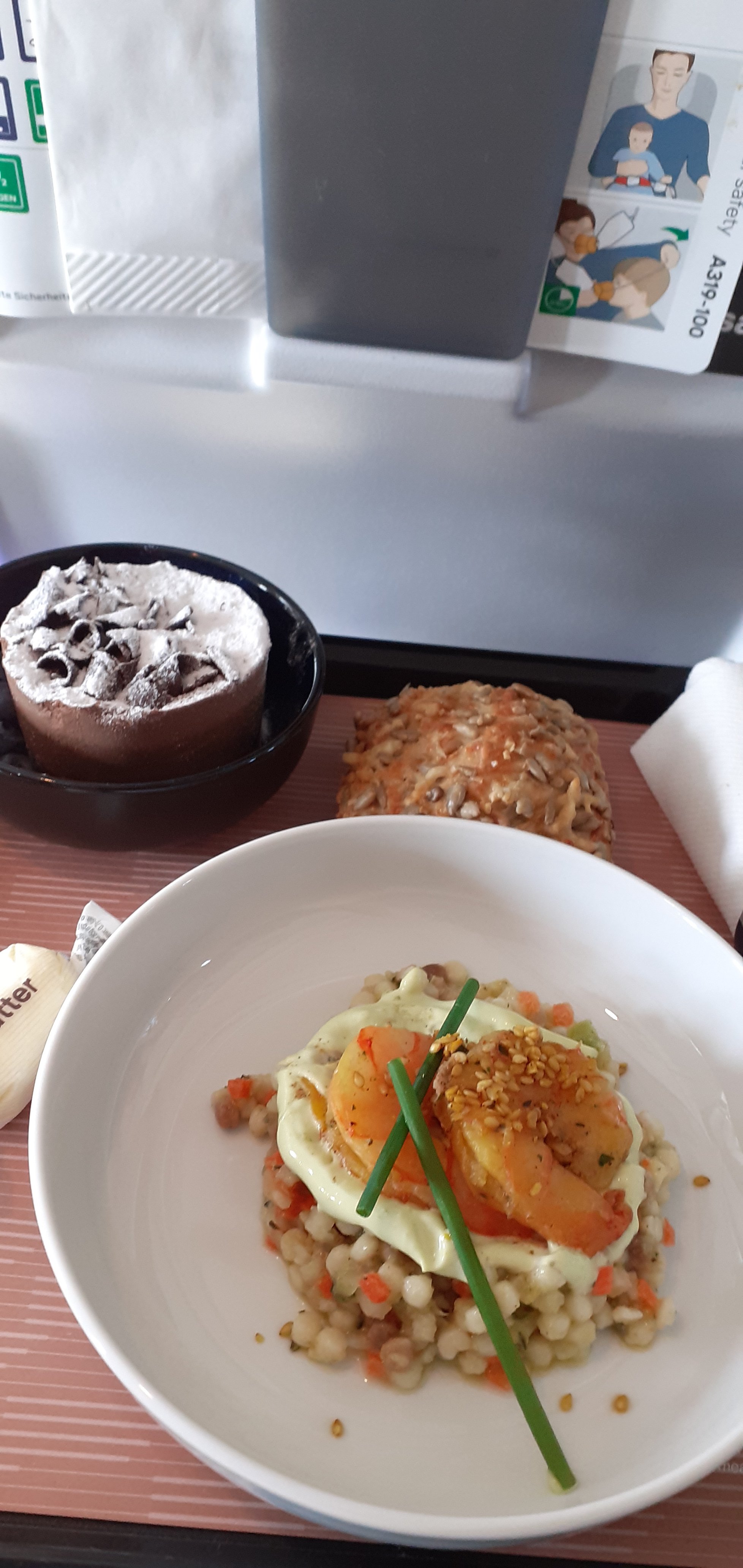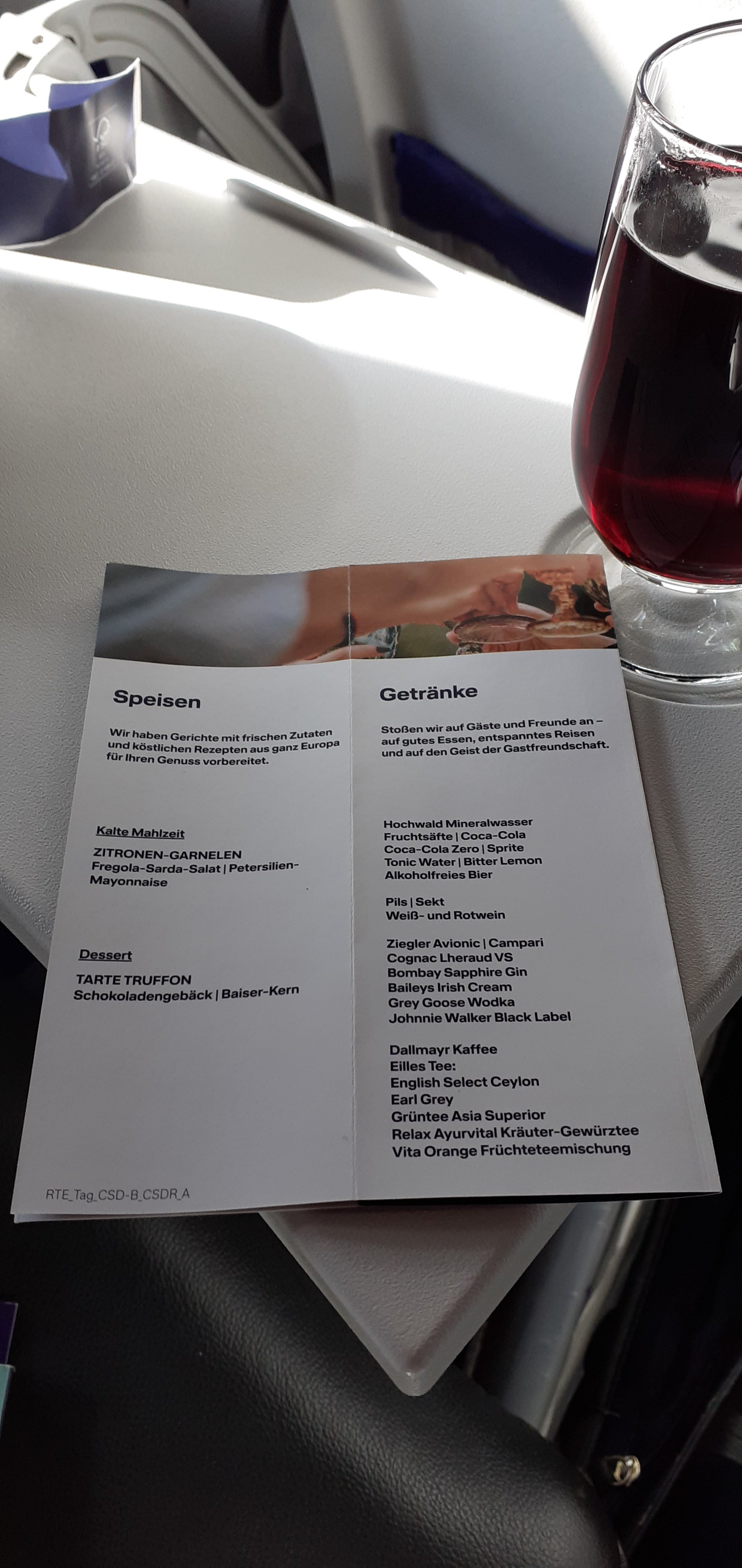 Lufthansa business HEL-FRA. Mycket bra mat o service. 3 rätters varm måltid med fördrink. Helt klart i nivå med Aegean och Finnair. HEL räknas väl till dom längre intra EU rutterna