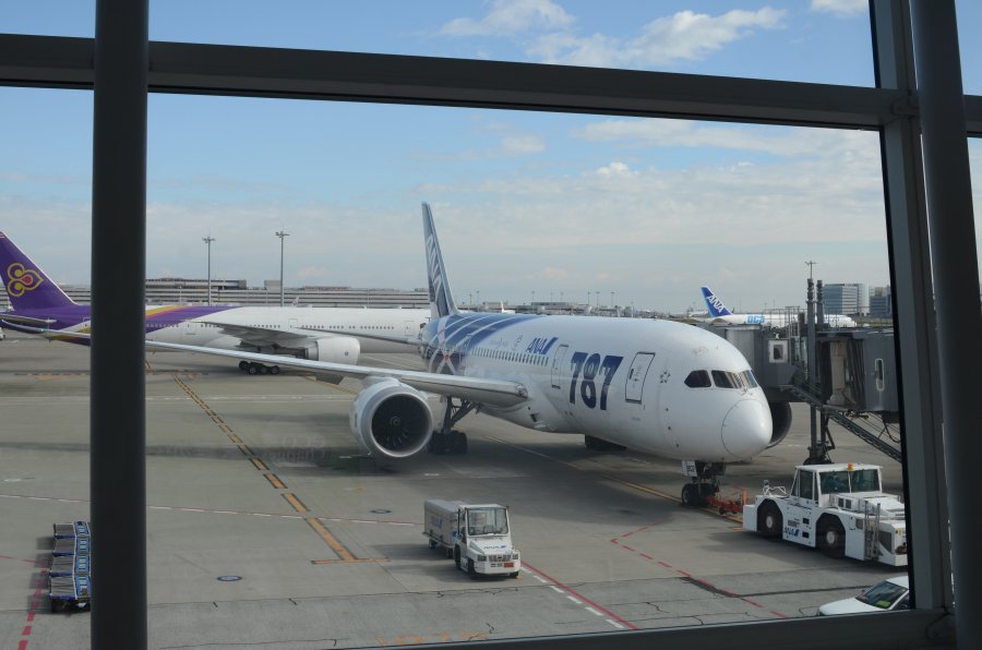 Utanför fönstret står vad jag tror är mitt nästa transportsätt. ANA 777-300ER. Säte 2K.