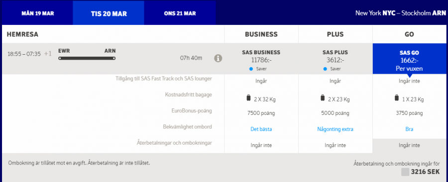 För att summera detta så kostar SAS alltså 3540 kronor och då ingår följande