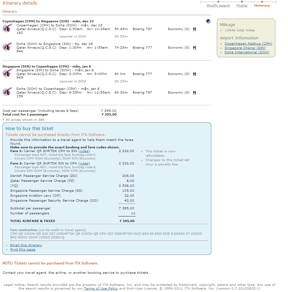 Kollar biljetter till Singapore precis innan jul åt en vän. Hittade denna biljetten i ita matrix men hittar inget liknande på qatars hemsida, expedia eller liknande. Bör jag be henne vända sig till en resebyrå eller hur ska man få tag i biljetten? Finns biljetten helt enkelt inte?