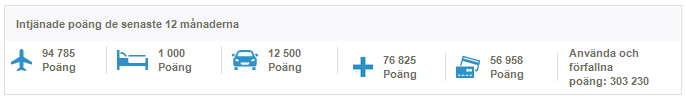 Då är ännu ett intjäningsår avklarat idag och dags för bokslut. Medvetenheten som resenär har fortsatt att utvecklas i en positiv riktning. Mitt första år hände inget, mitt andra blev det EBS och det här tredje medförde steget till EBG. Flyg 57 %, 58 130 poäng Hotell 3 %, 3 200 poäng poäng Hyrbil 0,5 %, 500 poäng Övrigt 5 %, 5 500 poäng Kort och shopping 34 %, 33 951 poäng För övrigt hade jag 79 430 nivåpoäng tack vare kampanjerna i vintras samt 37 kvalificerande flyg. Så passande med det 100:de inlägget också.