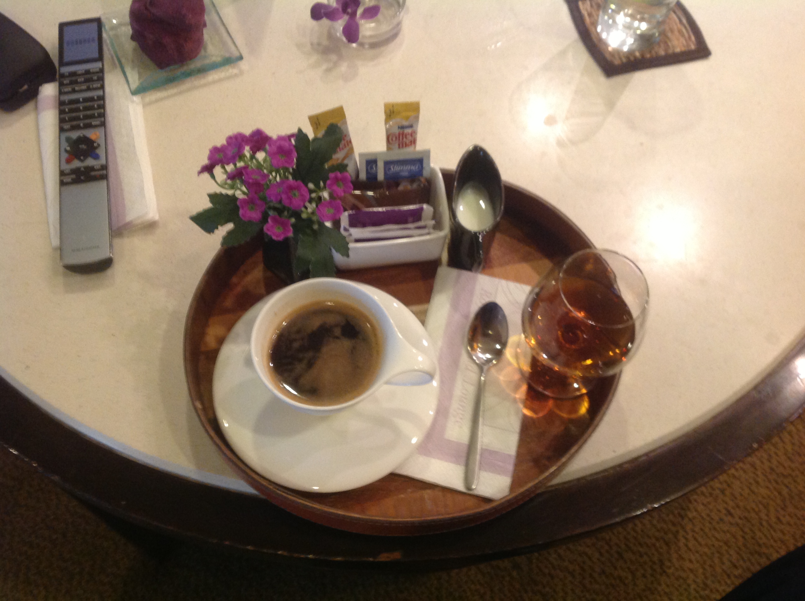 Jag var lite orolig att fastna i trafiken och missa planet vilket skulle ha varit en katastrof så jag beställde väckning 05.20 för att hinna lämna hotellet till klockan 6. Frukost fick det bli i loungen dit jag kommer in med mitt Diners Club kort.