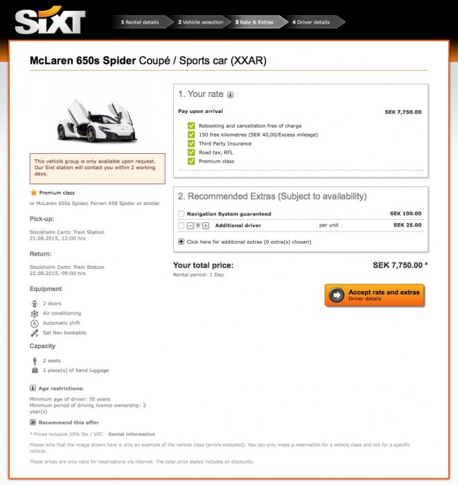 Jag talade just med Sixt. Tydligen är 458 Spider såld. Deras McLaren 650S blev smälld förra helgen i Stockholm pga vårdslös körning "kommer bli dyrt för kunden" :)