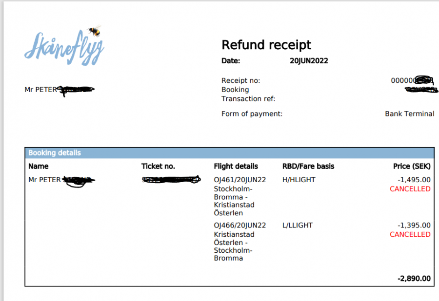 Skåneflyg har krediterat flygningarna utan att jag har behövt höra av mig även returen verkar vara inställt mycket snabbt behandlat, förutfattad mening trodde de skulle ta flera veckor!
