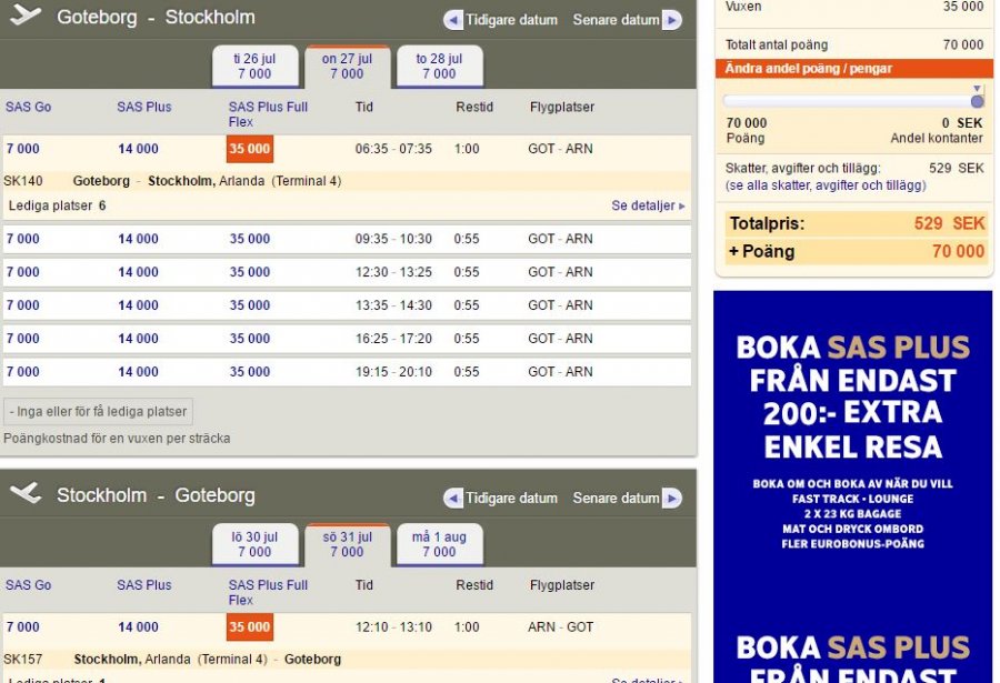 Men hur lyckas du komma upp i etthundrafemtiotusen poäng för en resa t/r Stockholm? Även i Plus Full Flex tur och retur kommer jag bara upp i 70 000Ja, tyvärr fanns det inte så många alternativ.
