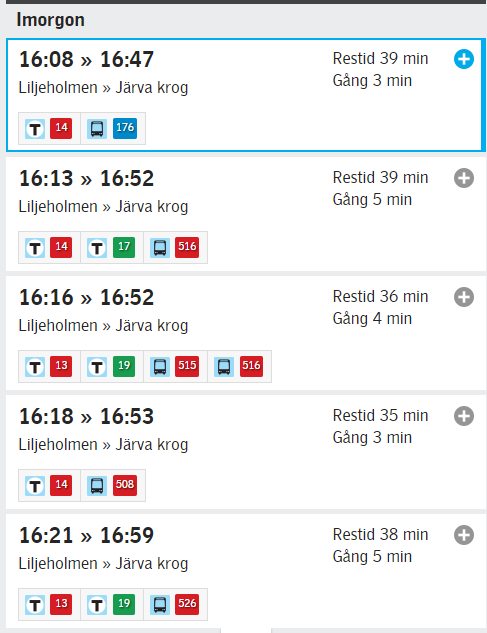 Enligt sl.se får jag upp följande förslag på resa från liljeholmen (lättast är att söka själv och sedan klicka på alternativen för att se var man ska byta.