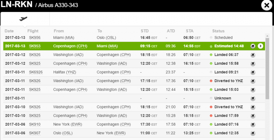 Om man tittar på det faktiska flygförloppet på avgången från Washington den 10 mars görs ingen diversion till Halifax, däremot går avgången den 11 mars ner i Halifax.