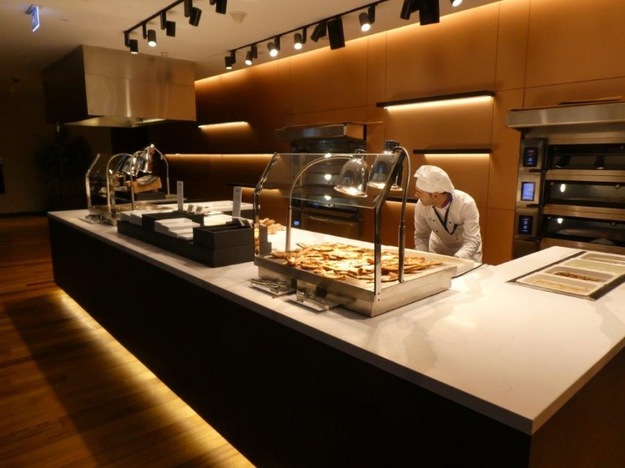 Till vänster vid ingången stod ett självspelande piano. Sedan var det en väl tilltagen del för mat och vila. Det fanns ett antal olika matgrupper där kökspersonal bland annat stekte kebab och bakade bröd. Drycker fanns för självservice, både alkohol och alkoholfritt. Vinutbudet var ganska enkelt. Tyvärr fanns ingen champagne när jag frågade men det är ju numera svårt att hitta i Gold loungerna, i Europa i alla fall. Det hade annars varit trevligt på invigningsdagen. Ett enklare utbud av spritflaskor fanns också för den som så önskade. Ett bord med olika sorters teer fanns i en salong. Maten var dock mycket välsmakande eftersom den till stor del lagades direkt innan servering.