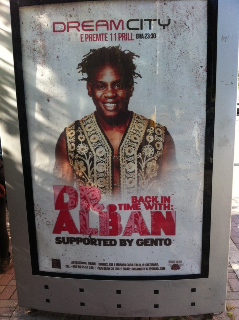 En hel det OT, men tyckte det var ganska kul ändå. Om ni undrar vart den sjungande tandläkaren Dr Alban håller hus numera så stötte jag på denna affisch nere i Tirana igår. D.v.s. Dr. Alban är i Albanien och har en konsert där ikväll enligt datumet på affischen :)