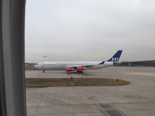 På tal om fönster så kunde man genom dessa skåda en bekant syn. SAS mot CPH låg före oss i kön men fick se sig omkörd.