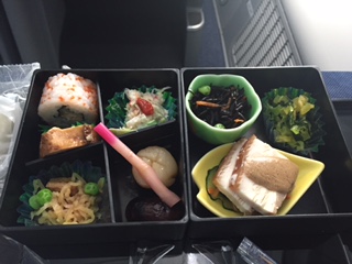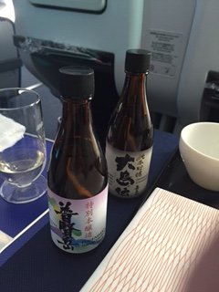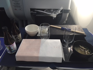 Innan maten blev det så till slut ett glas bubbel. En liten flaska Charles Collin – ok men blir kanske inte en ny favvis, spar det omdömet till dess att jag haft champagneprovning på F-flighten på lördag. På tal om provning – när maten kommer får jag frågan om vad jag vill dricka till – naturligtvis svarar jag Sake! Om jag ska klaga på något så är det utbudet av dryck. För rött och vitt vin och sake finns bara ett alternativ. Fast det visar sig dessbättre inte vara helt sant. Flygvärdinnan kommer med två olika sorters sake och tycker att jag borde prova båda vilket jag naturligtvis går med på.