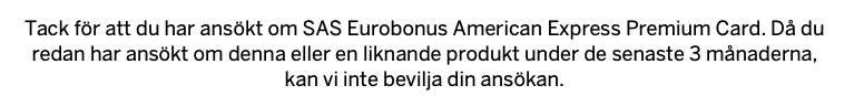 Man kan bara ha 2 amex produkter, och verkar finnas någon regel på 3 månader också om man byter kortAnsökte precis om ett premium (som jag tidigare aldrig haft) Har Elite och tidigare ansökte om Classic under tidigare kampanj. Fick avslag nu när jag ansökte om premium - fler som fått det?