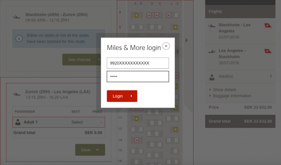 När du väljer ett prefered seat så blir du tvungen att logga in på ditt Miles&More konto för att välja platsen. Logga in på kontot som vanligt.