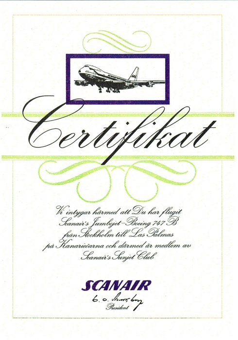 I början av 70-talet delades ett diplom ut till Scanairs 747-resenärer, som i och med detta upptogs i