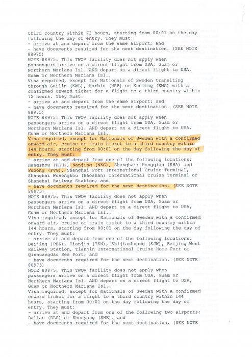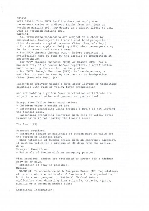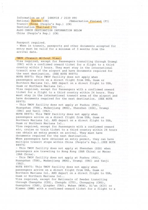 Stockholm-Helsingfors-Nanjing med Finnair. Returen Shanghai-Bangkok-Stockholm med Thai fem dagar senare. Nanjing och Shanghai ligger i olika provinser, men bägge provinserna ingår i samma visumfria zon.