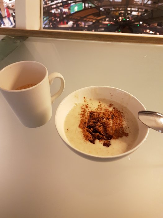 Grötfrukost i loungen, till och med för tidigt för fika för mig.