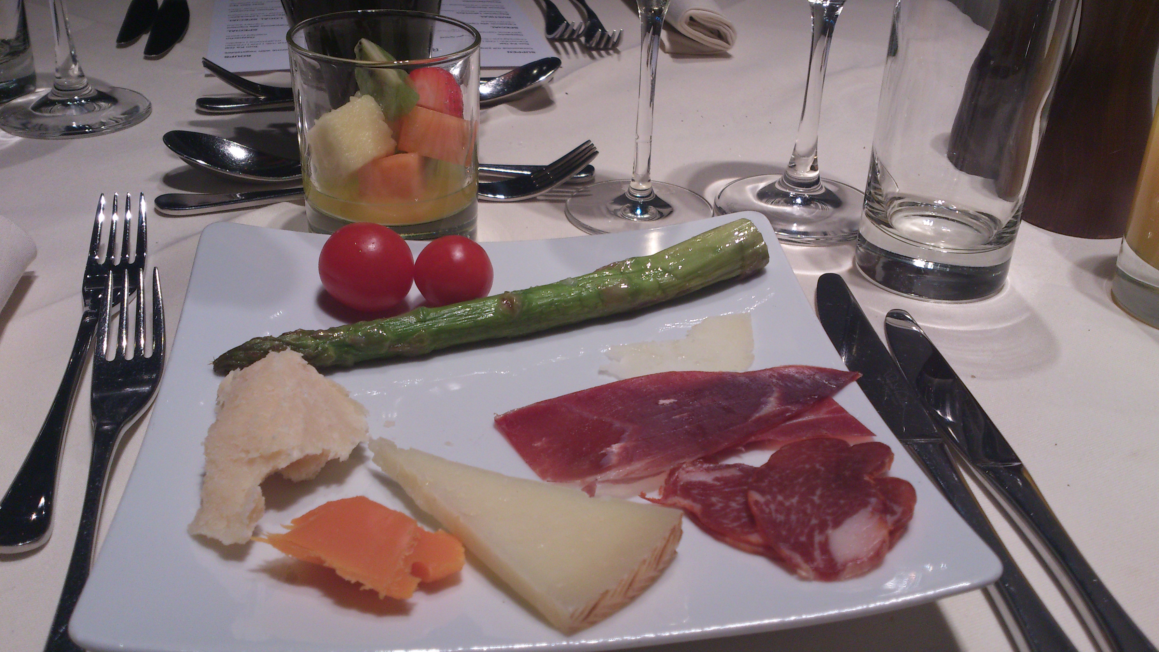 Beställning av mat togs och jag valde kötträtten till huvudrätt och avstod hummern till förrätt (är inget fan av hummer över huvud taget). Låter bilderna tala för sig, lite besviken på köttet dock, smakade bra men var lite väl genomstekt enligt mig. Till efterrätt valdes en ostbricka som fick avsluta en mycket bra måltid ombord även om huvudrätten kunde varit lite bättre.