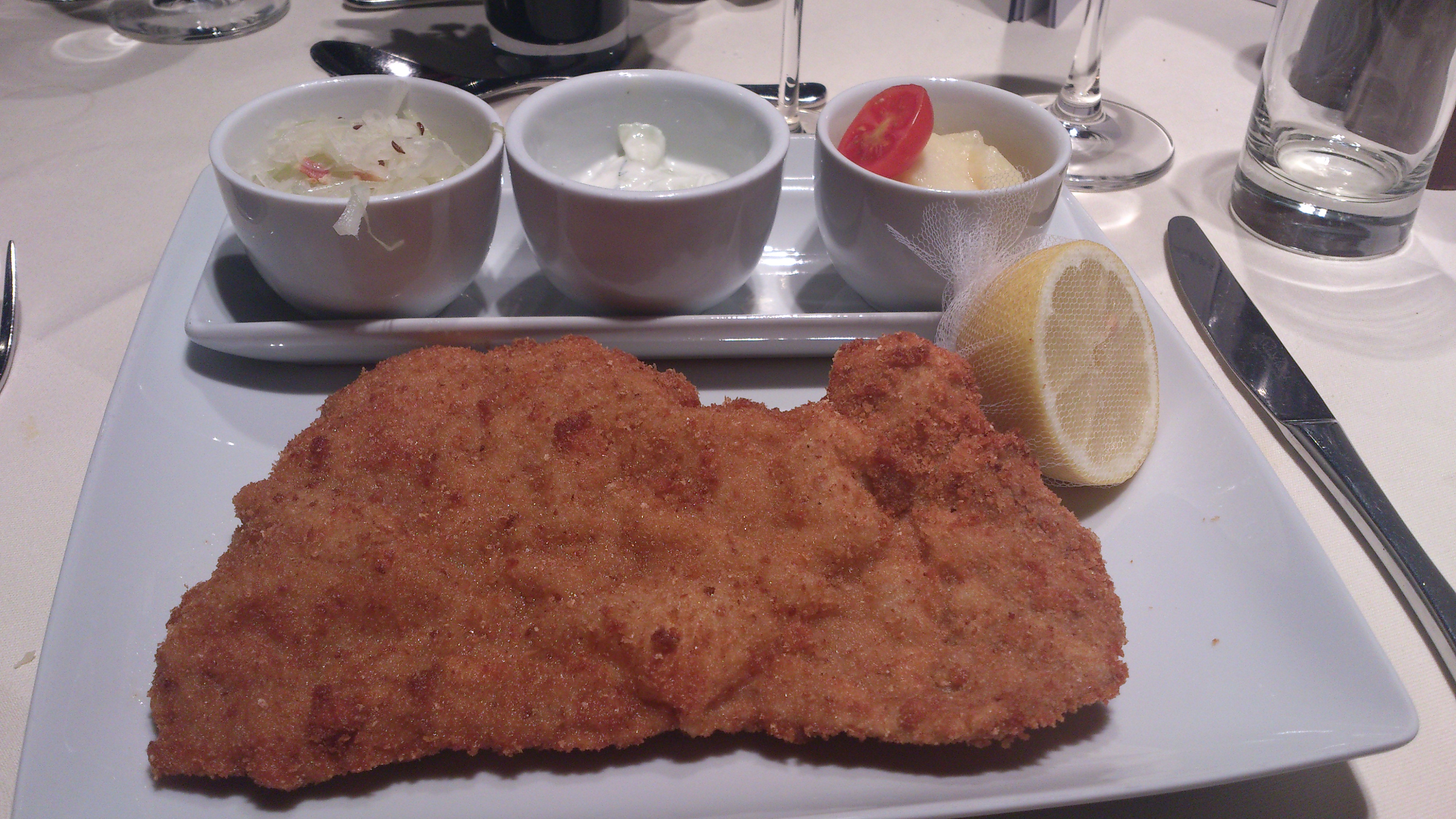 Efter att jag badat klart var det dags för frukost i restaurangen. Lite svårt att välja var man skulle börja, fanns så mycket att välja på och det mesta såg så gott ut. Beställde i alla fall in en schnitzel och plockade ihop lite lättare mat i väntan på maten. Beställde in ett glas champagne som sig bör. Fanns 6 stycken olika sorter i loungen, ingen aning om vilken jag serverades men det var perfekt frukostdryck en dag som denna.