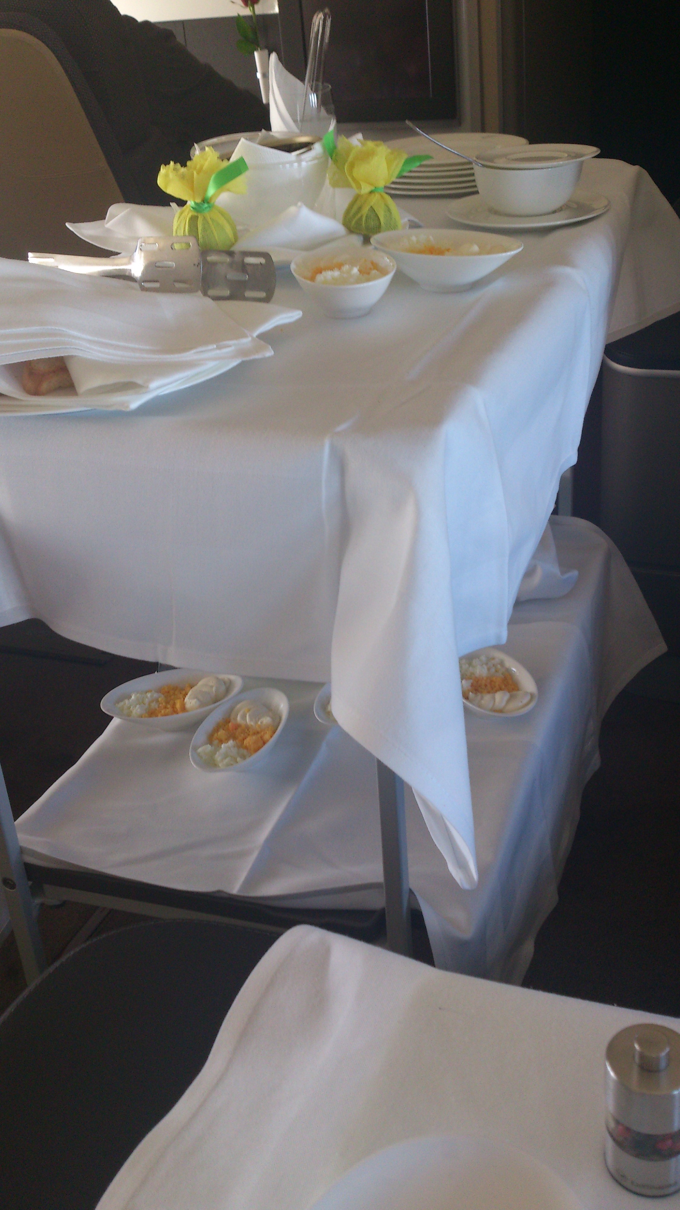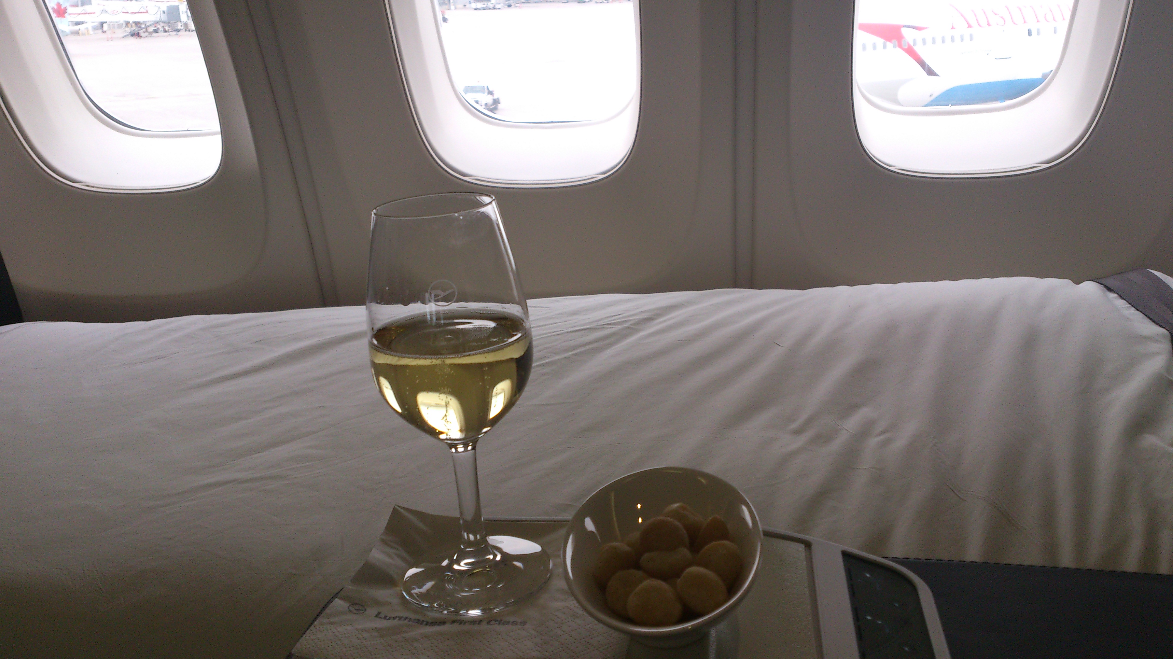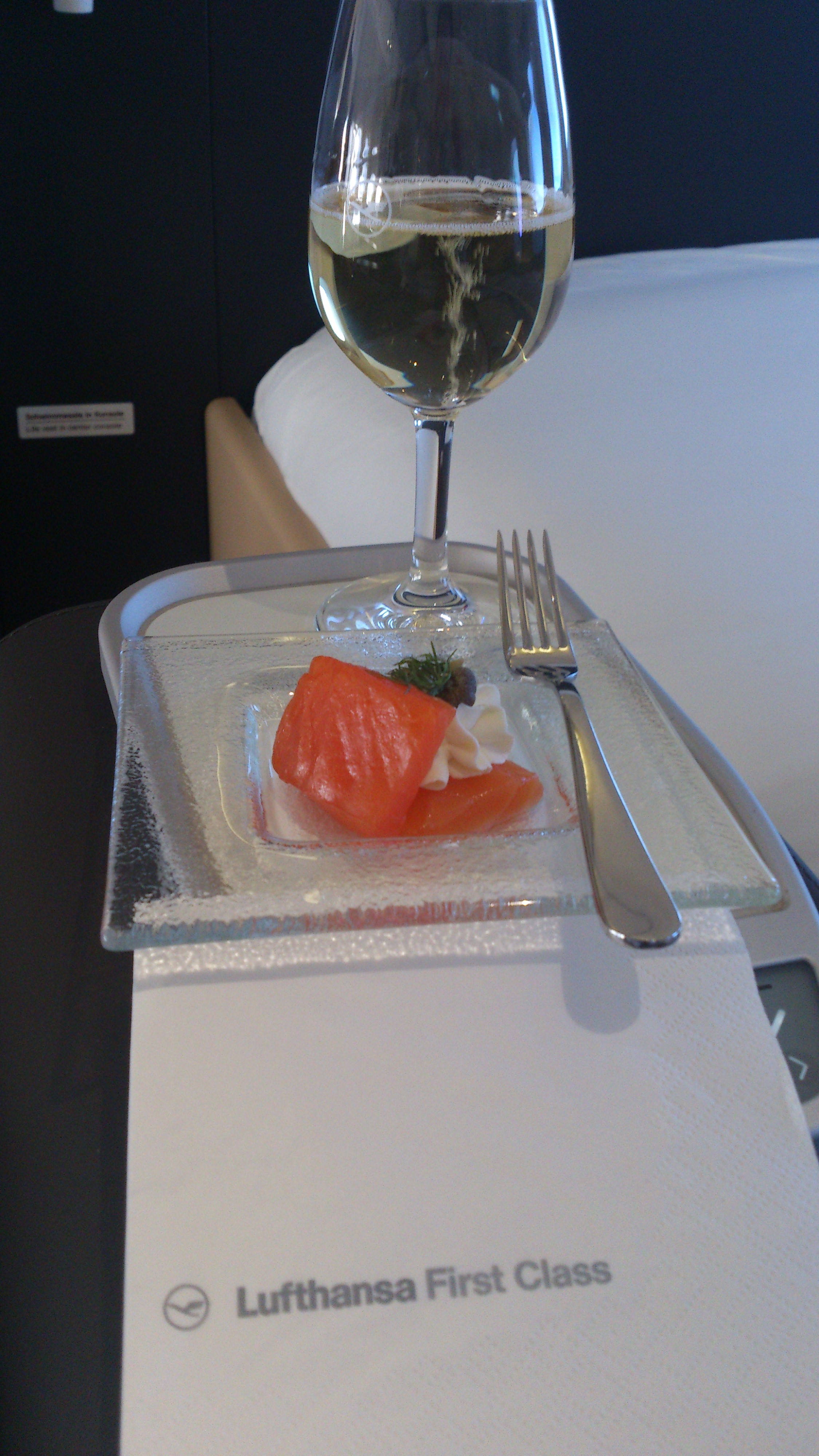 Var ordentligt trött efter maten och det var hög tid att byta om till pyjamas och lägga sig. Somnade mer eller mindre på en gång i den sköna sängen. Tyvärr blev det inte så mycket sömn innan det var dags för inflygning till Frankfurt. Blev bara lite frukt till frukost, är ingen frukostmänniska alls och har svårt att äta något direkt när jag vaknat. Jag hade trots allt First Class Lounge i Frankfurt att se fram emot.