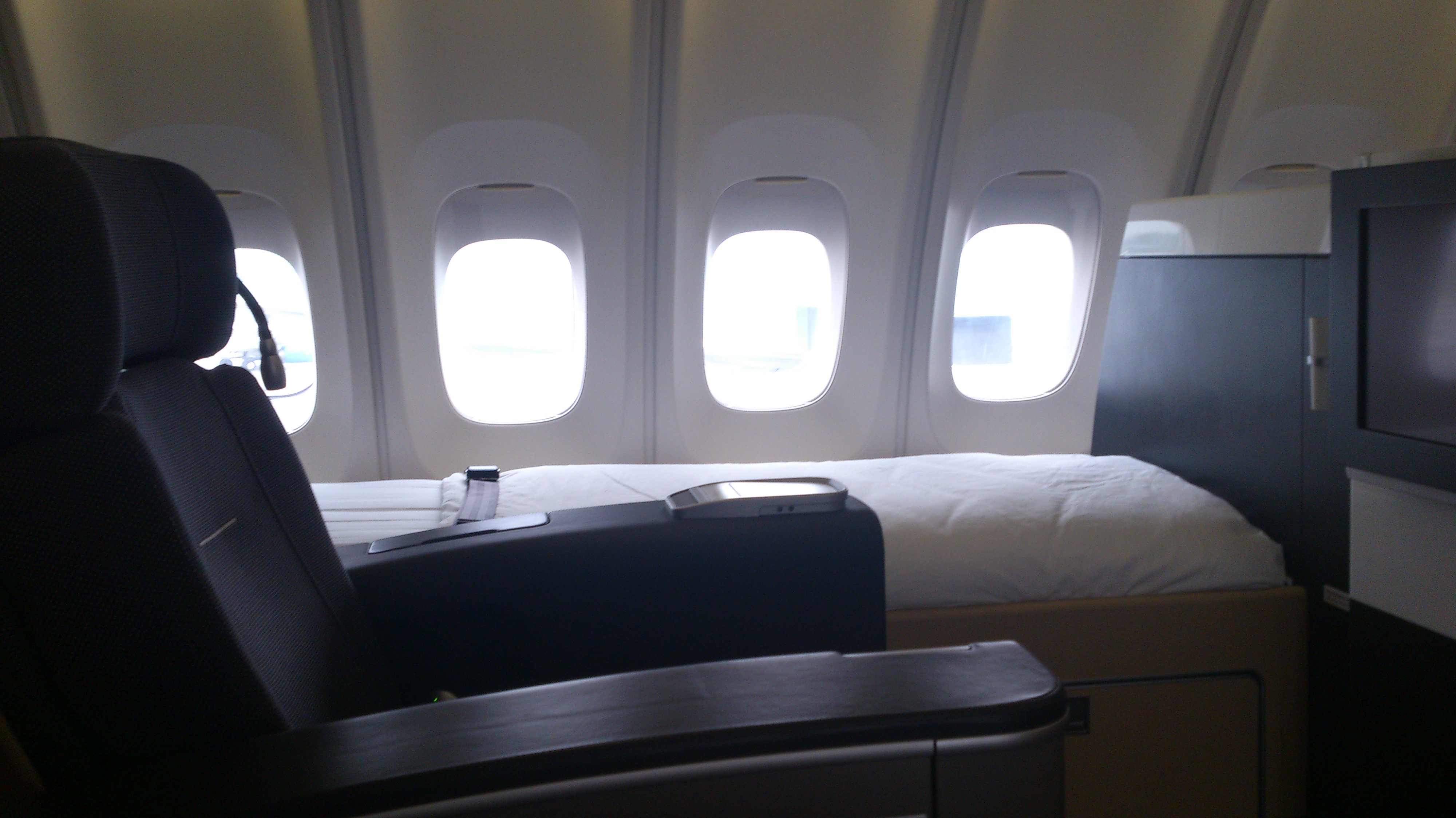 Välkomnades upp till övervåningen och blev direkt erbjuden ett glas champagne. Enligt menyn skulle det ha funnits 2 olika att välja på, dels samma som på utrsean men även Taittinger Comtes de Champagne Rosé Brut. Visade sig dock att bara den vanliga champagnen fanns ombord. Serverades ett glas samt lite varma nötter och fick frågan om det var något mer de kunde göra för mig, i och med att jag var ensam på övervåningen frågade jag direkt om det fanns möjlighet att få besöka cockpit någon gång under resan. Frågan ställde honom lite men han skulle gå och höra med kapten. 20 sekunder senare var han tillbaka med följande hälsning ”Mr Palmen, as a matter of fact it’s a good opportunity to visit the cockpit right now if you wish”. Som “flygnörd” så var detta riktigt uppskattat, var alltid framme i cockpit när detta tilläts innan 9/11. Spenderade väl ca 15 minuter där framme och pratade med kapten och styrman om allt som hände innan avfärd. Visade sig att planet var i stort sätt helt fullt förutom 3 lediga platser i First men att de hade 2 jumpseats som sedan skulle få första raden i First-kabinen. Tackade så mycket för mig när det var dags att gå tillbaka till stolen och slog mig ner för att avsluta den champagne jag knappt hade hunnit börja på tidigare.