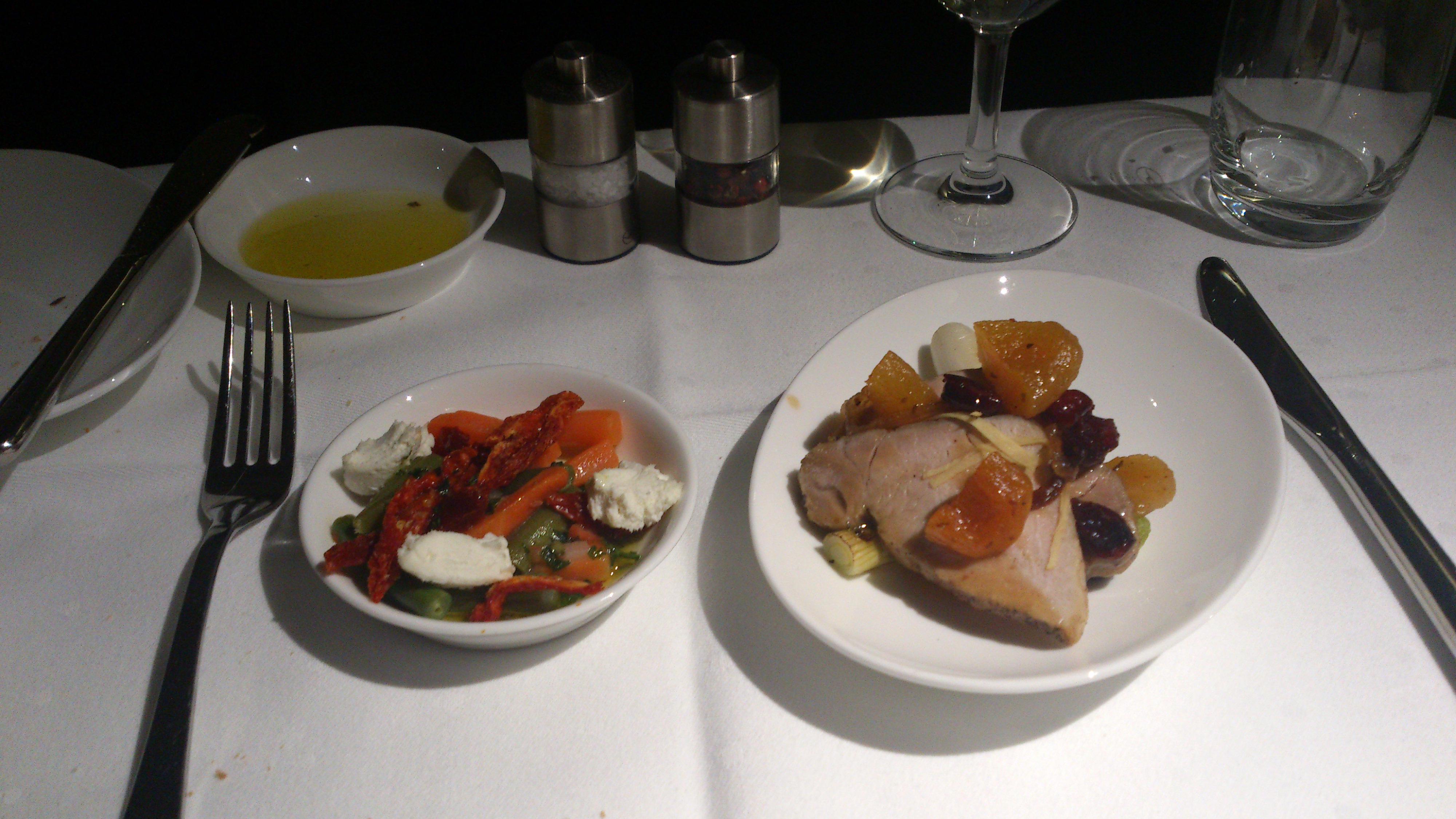 Tog in 2 små förrätter och lite vitlöksbröd innan det var dags för huvudrätt. ”Pork Medallion with plum sauce”, samt “Green bean salad with crumbled goat chese”.