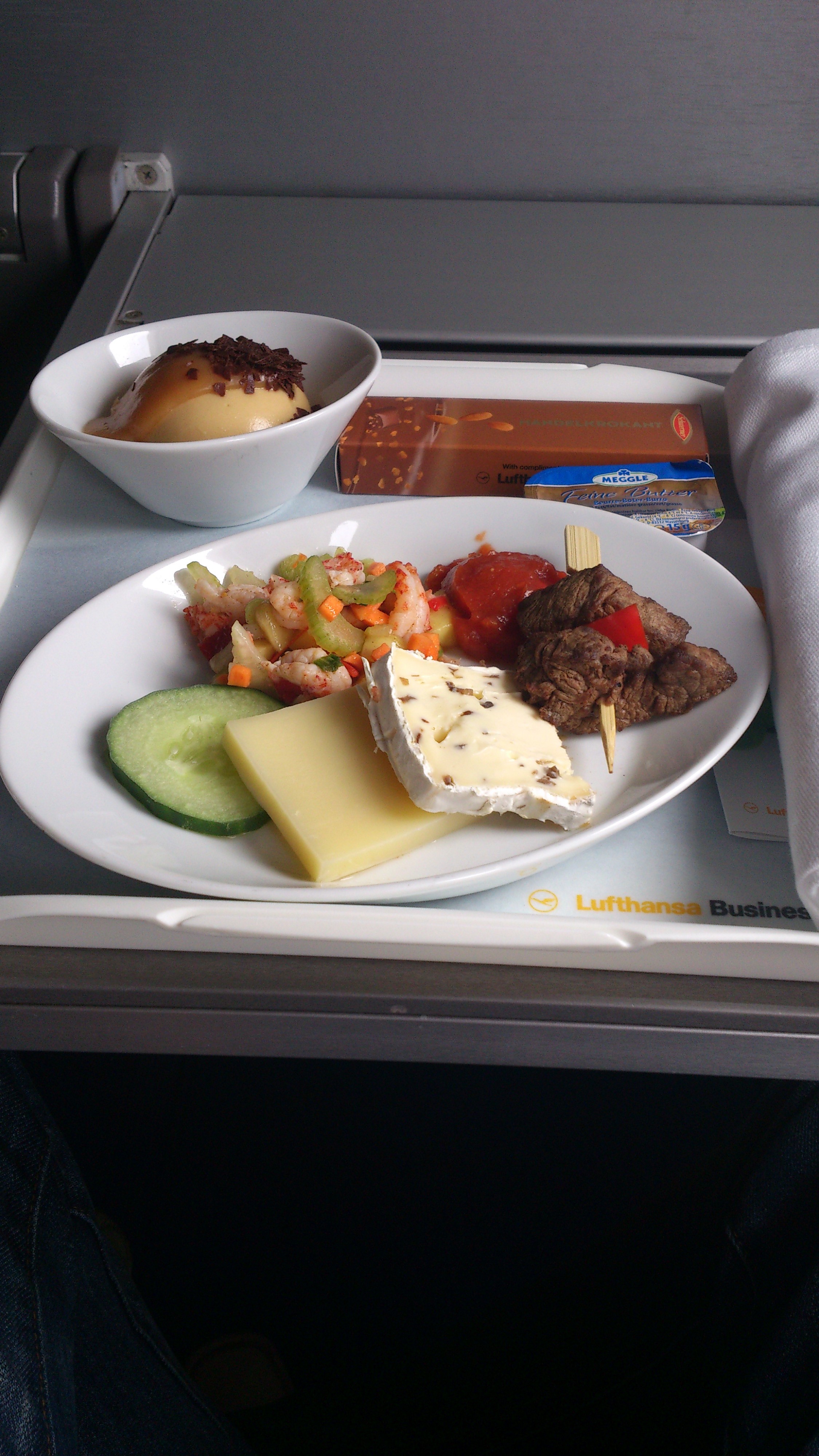 På denna flight serveras kött med BBQ-sås, Skaldjurs-sallad och lite ost. Till dessert serverades en toffee mousse. Var inte direkt hungrig och fortfarande trött i kroppen. Åt upp maten och halvsov resten av resan.