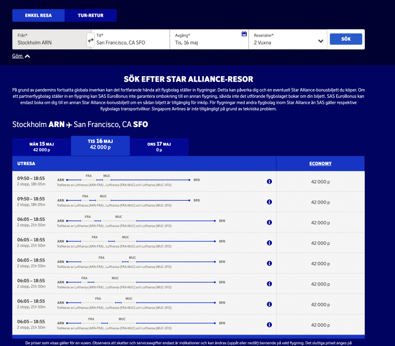 SAS sida klarar inte långa connections, framförallt inte om den är över natten. Att awardfares har ju ingen egen availability utan läser av andra hemsidor så inget konstigt att du hittar saker där som sas sida inte hittar.Men det stämmer inte alltid... tyvärr... Många gånger (inte alltid) så visar Awardfarer tillgänglighet på AC samt TAP för Aeroplan men inte för EB, när man ringer så hittar de trots allt...men det jag undrar lite om SAS Star Alliance bokning alltid varit lika yxigt...??