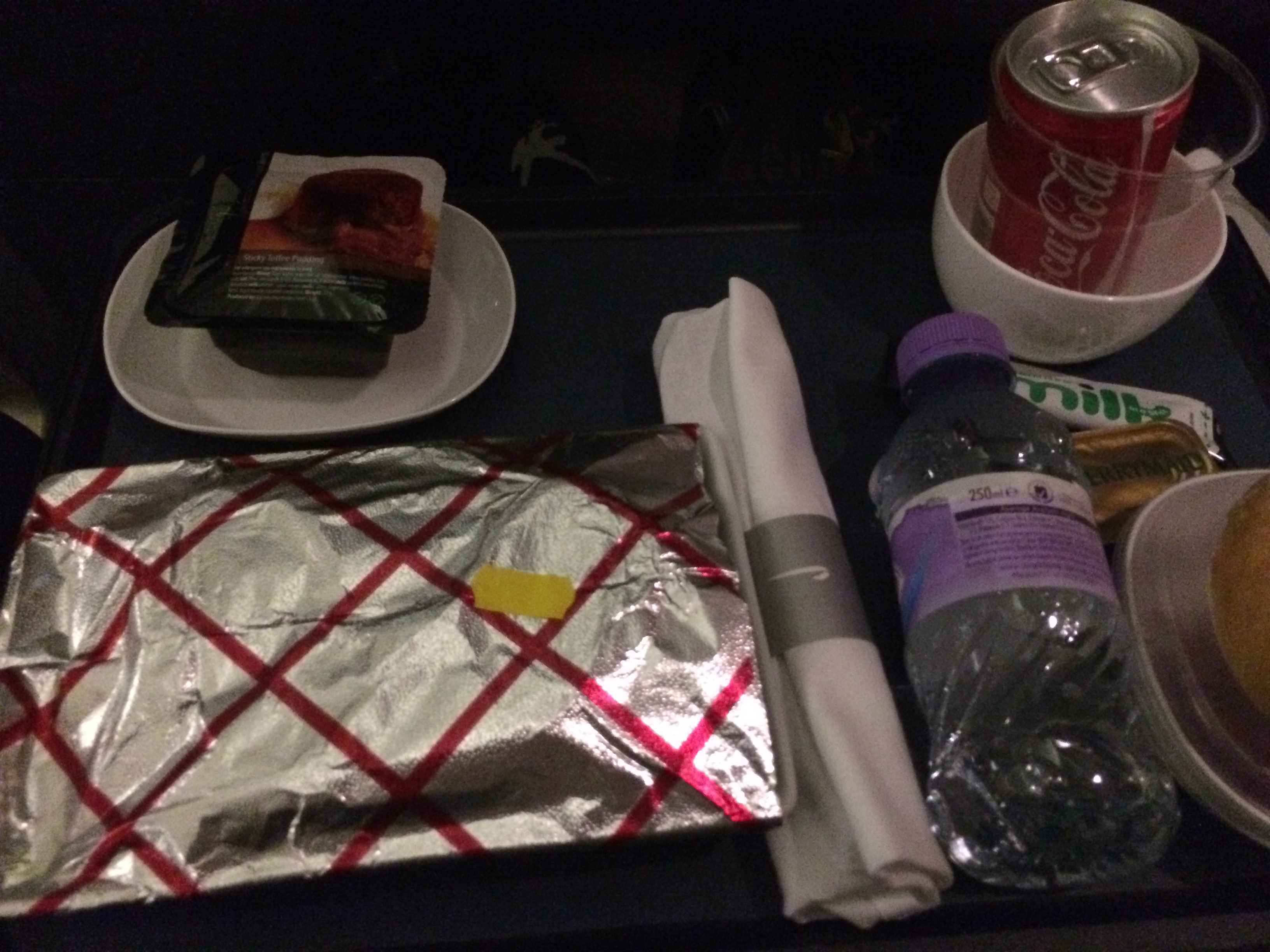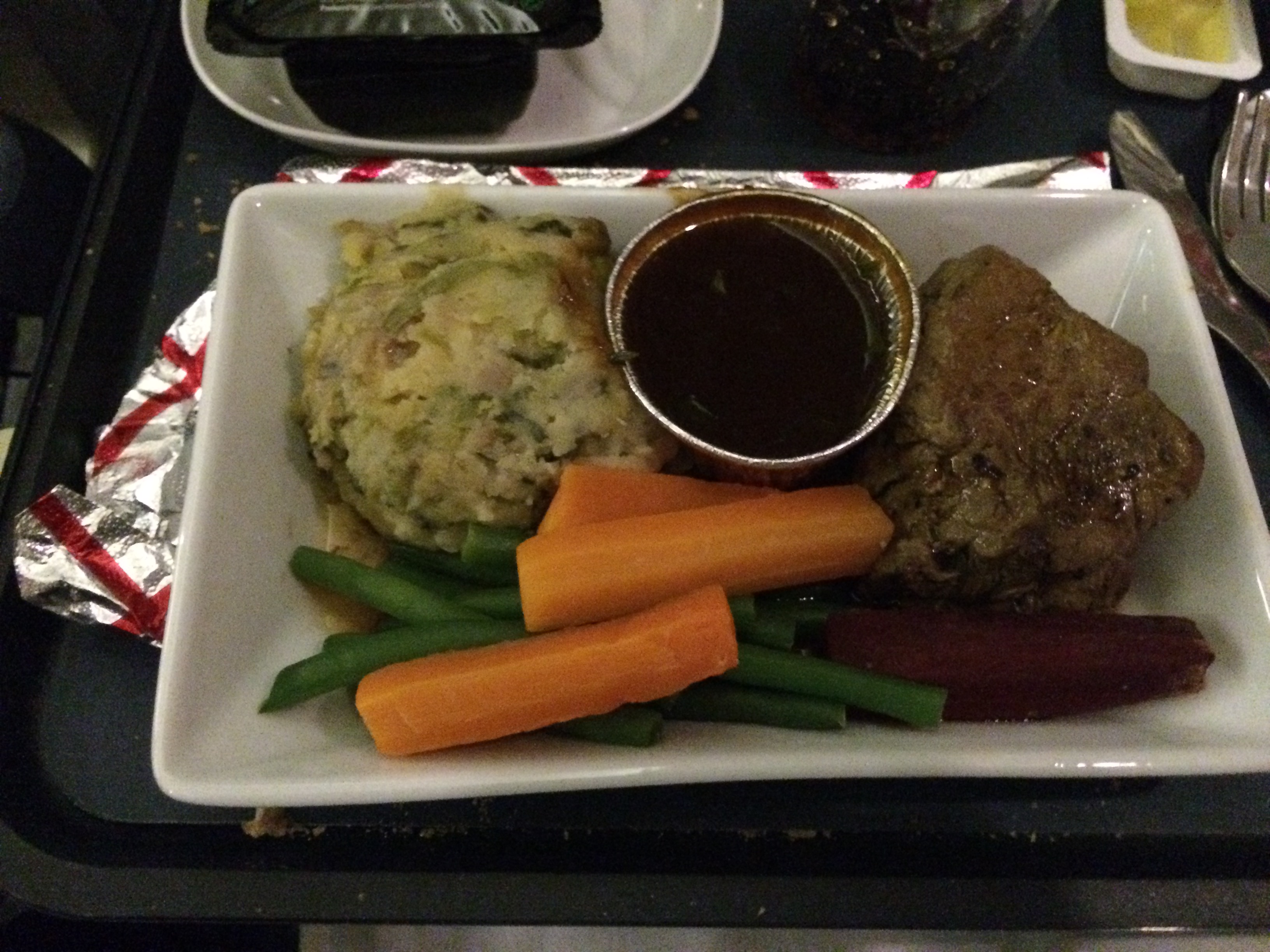 Efter knappt en halvtimme kom vi upp i luften och serveringen påbörjades, med dryck och snacks. Blev cola och kringlor. En stund senare kom maten, en riktig biff och riktiga bestick, för en som bara har åkt economy var detta stort! :)