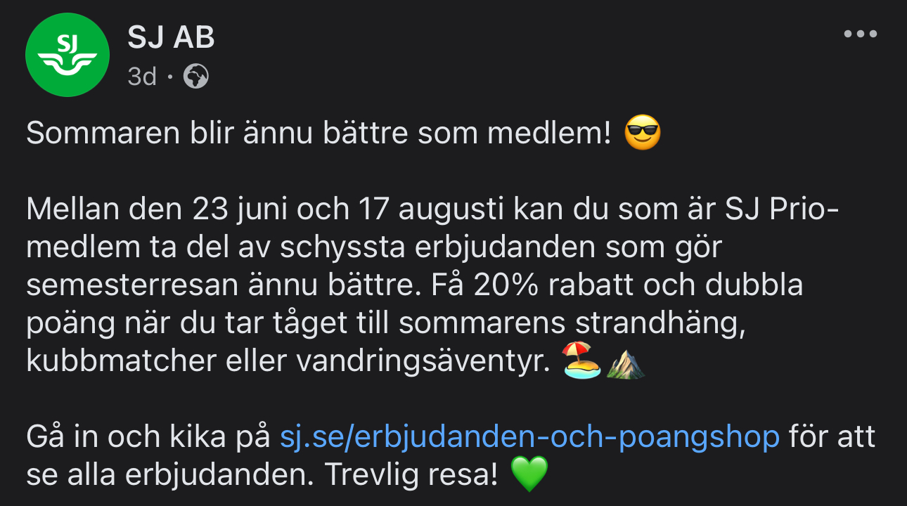 Idag fick jag mail om SJ Prios sommarerbjudande, de kom både i mail och finns på sj.se när jag loggat in.