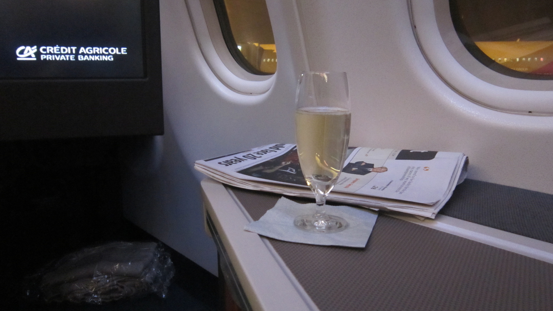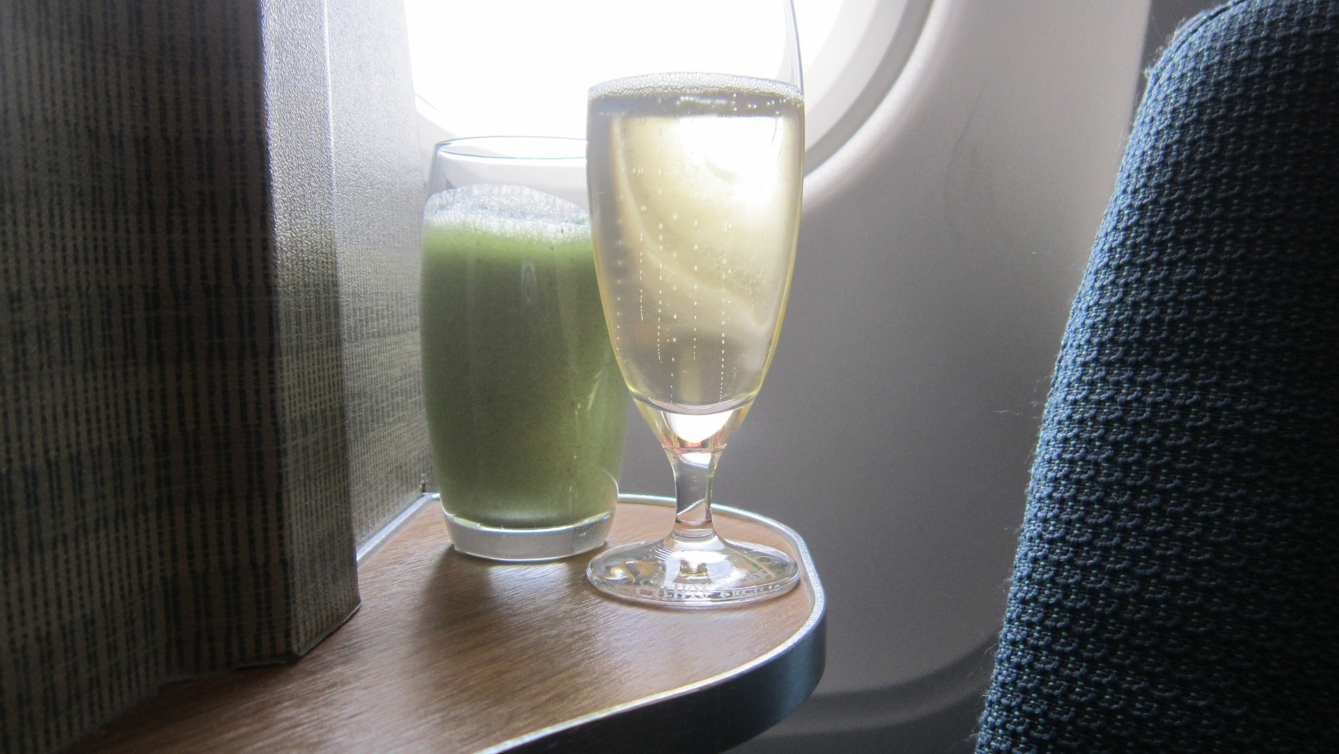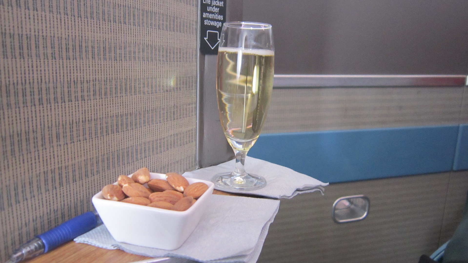 På denna flight märktes det också mycket tydligt att kabinpersonalen hade betydligt mera tid jämfört med den föregående flighten som bara var en och en halv timme. Den här gången behövde jag inte känna mig lite irriterad över att ha valt fel plats och hamnat trea från sluttat i matkön. När skylten med säkerhetsbälten hade släckts var det dags för en runda med dryckesvagnen. Det fick bli lite varma mandlar och ett glas champagne till. Hmmm, min champagnekonsumtion i samband med flygningar har ökat signifikant sedan jag var på tvåårsjubileet.