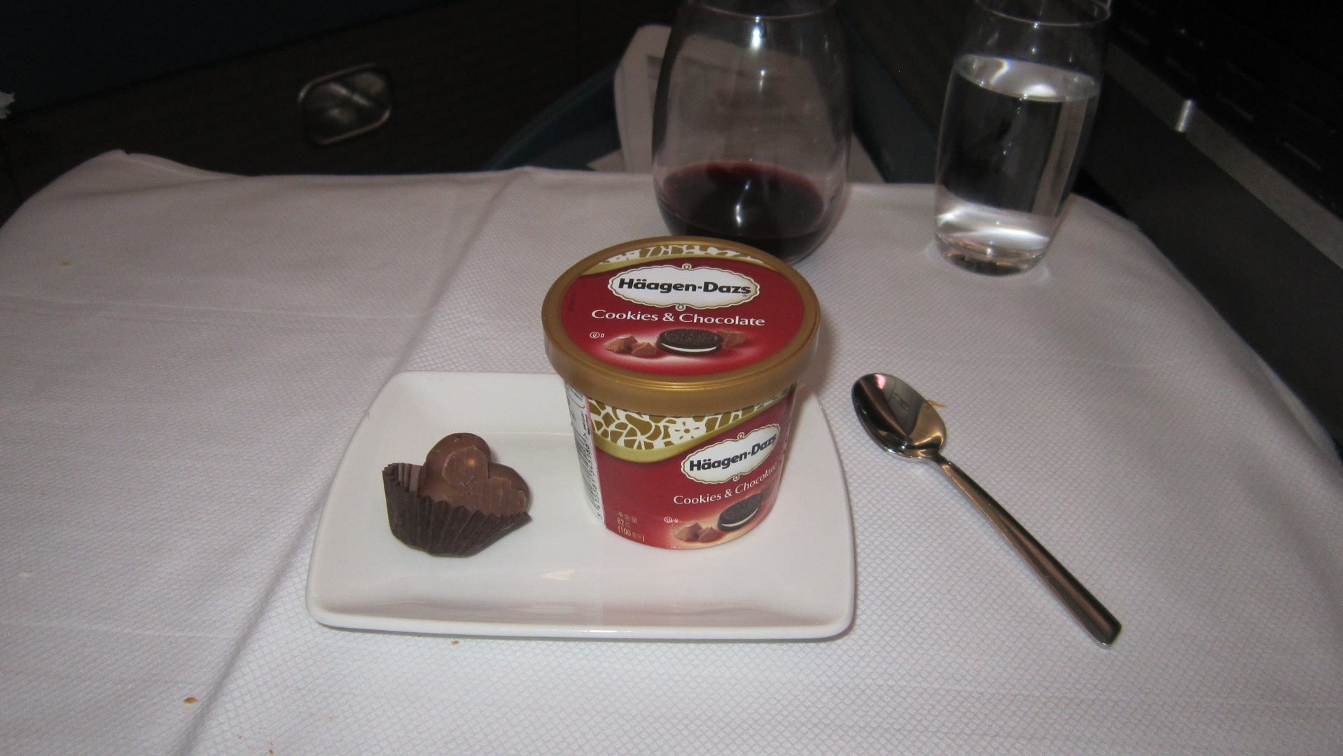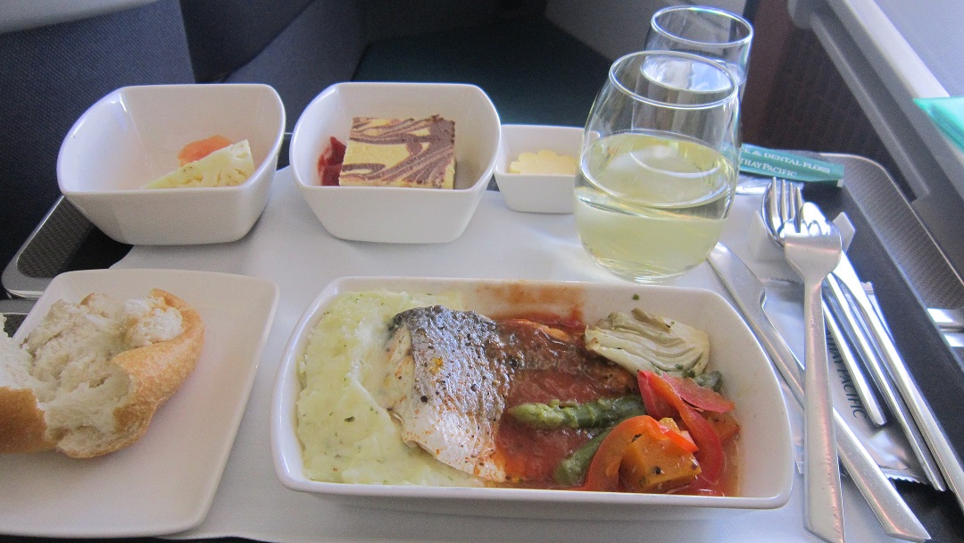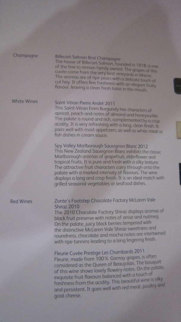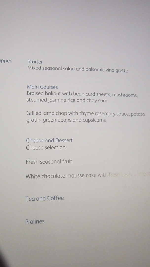 Även på denna flight tog man det lite lugnt med serveringen. Först dryck och mandlar och efter ytterligare en stund började serveringen. Som sagt lite märkligt för en flight som avgår efter midnatt. Men, men, är man på ett mileage-run ska man kämpa sig igenom menyn. Den här gången kunde man välja mellan två rätter. Mitt val hamnade på hälleflundran och vitt vin till den. Vinlistan var fö identiskt med den från föregående flight.