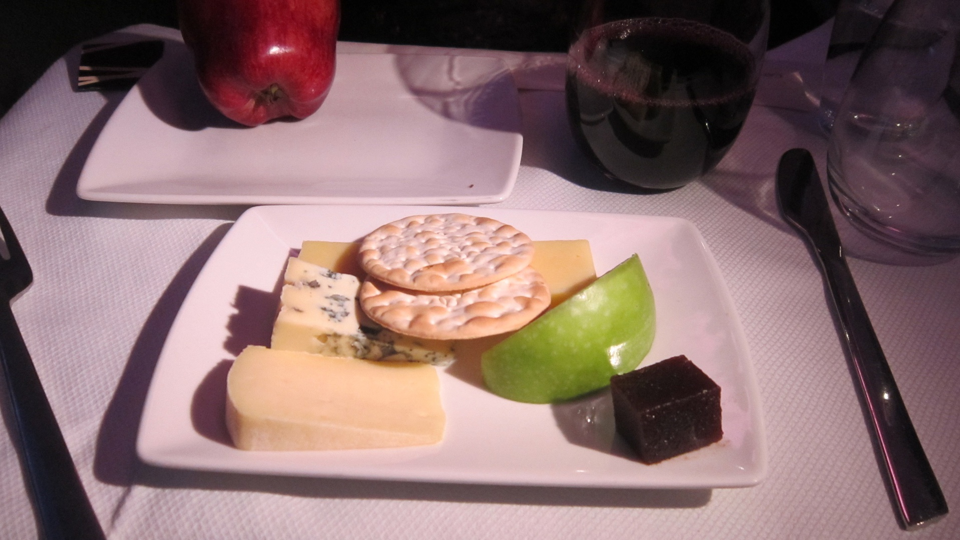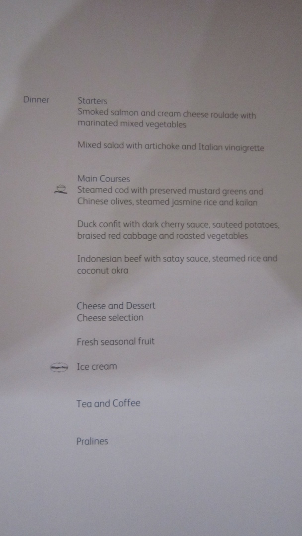 Även menyn var något mera omfattande. Det fanns tre huvudrätter att välja på och jag fastnade för den indonesiska biffen. Inget fläskkött i sikte, här är det som sagt halal som gäller. Ill maten fick det bli det röda Shiraz vinet. Till min glädje serverades det även en liten ostbricka och måltiden avslutades med en Hägendaas och en chokladpralin.