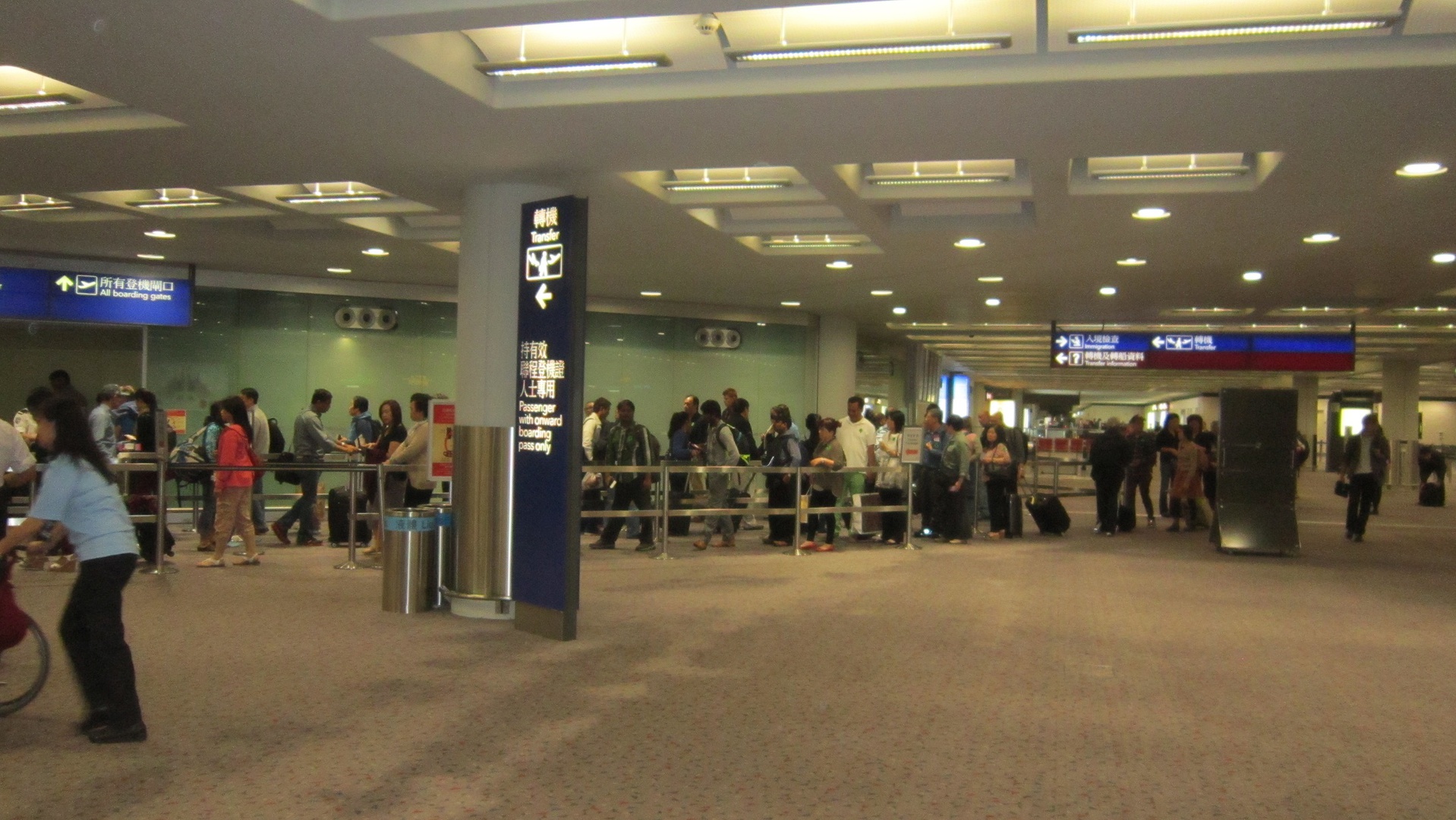 Jag fick några timmars sömn i den mycket bekväma stolen och vi anlände enligt tidtabell till HKG. Väl där möttes jag av en syn som jag aldrig sett förut: Kö till transfern, vad i….