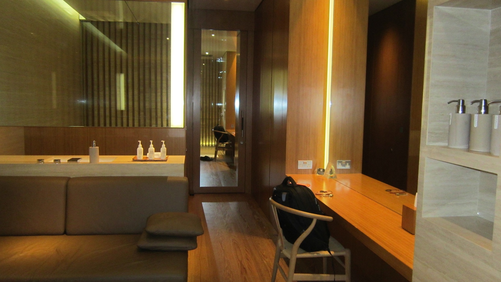 Men eftersom jag har ett e-channel pass var det bara att gå genom immigration på 30 sekunder, upp till avgångshallen, ingen kö i säkerhetskontrollen och igenom immigration på 30 sekunder igen. Kände mig ganska nöjd med att jag kom på det här. Sedan var det bara att gå raka vägen till The Wing och den hägrande cabanan. Nu visade det sig vara kö dit. Jag fick en grön plastpuck med lampor som skulle börja blinka när något blev ledigt. Lär väl ta en timme tänkte jag, så det fick bli lite frukost i The Heaven. Efter ca 10 minuter började pucken att blinka, så det blev att kasta i sig birchermuslin snabbt. Detta vara mitt första besök i en cabana här och det var en trevligt bekantskap. Att kunna ta ett bad och sedan ligga och koppla av lite på soffan. Nu var den här soffan i och för sig inget under av bekvämlighet och låg man åt fel håll hamnade man i kallraset från luftkonditioneringen. Men det är helt klart värt att ta en cabana om det finns en ledig.