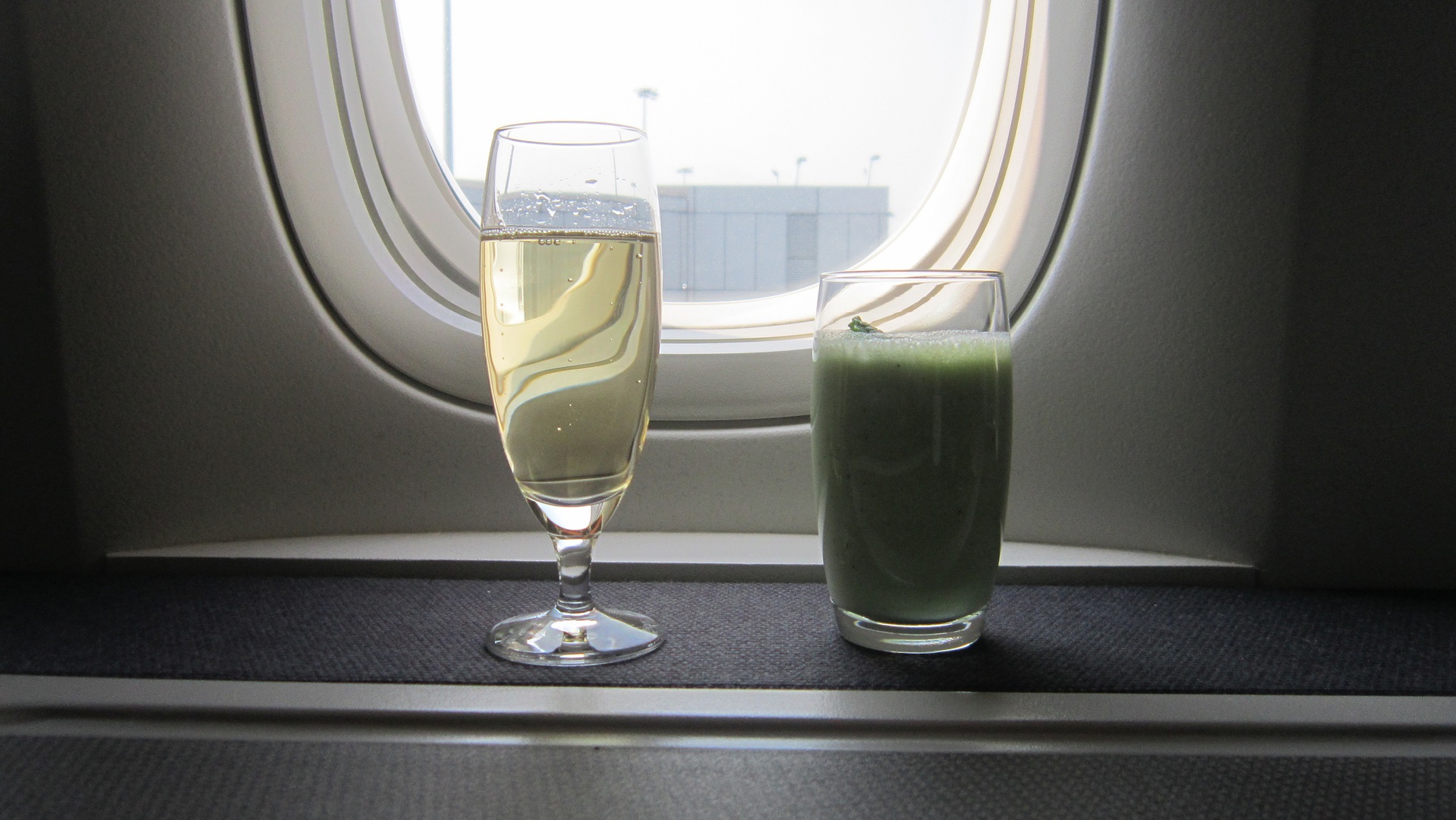 Avgången skedde från gate 43 så det var lagom att ta en liten promenad dit ut istället för tåget. Ett ögonblock trodde jag att det var samma plan som vi skulle ta som jag kom med från TPE, men det hade parkerat på gate 42. Det kunde i och för sig ha varit samma plan. Återigen var det en Airbus 340, exakt samma plantyp som jag hade anlänt med. Snabb och effektiv boarding som vanlig. Så fort jag var vid min plats erbjöds något att dricka, samt att flygvärdinnan tog hand om kavajen. Förutom champagnen fick det bli en Cathay delight, en alkoholfri drink som är baserad på kiwi och kokosjuice, mycket god.