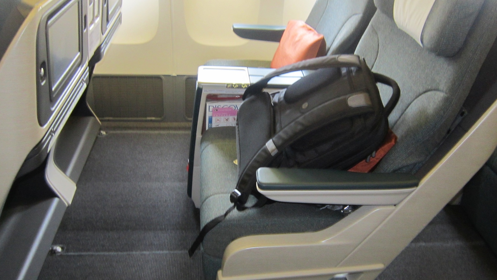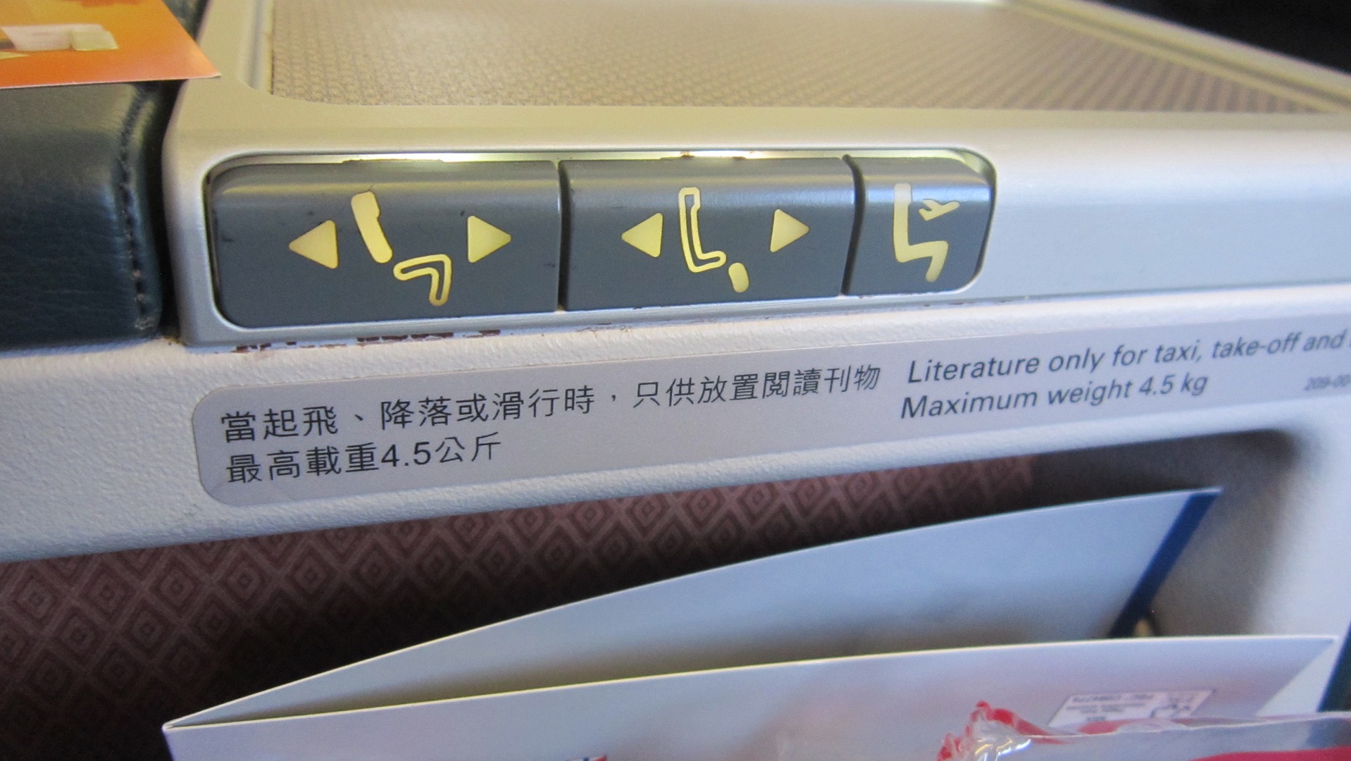 På flygningen till Taipei fick jag som sagt var möjlighet att testa Cathay’s nya regional business produkt och i jämförelse med den gamla var detta en trevlig bekantskap. Stolen är en skalstol, dvs man lutar sig inte riktning mot bakomvarande passagerares knä, utan stolen glider framåt. Testade att fälla den max och konstaterade att det skulle nog fungera alldeles utmärkt att sova sittandes i stolen. Så som ”recliner” fungerar den utmärkt, men den kan ju inte jämföras med en stol som kan fällas helt plant.