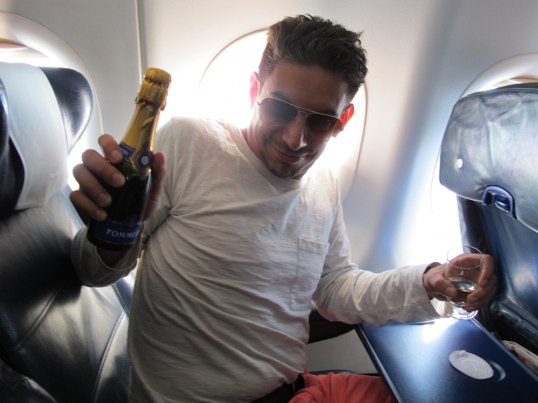 Till vår stora glädje är gästerna bredvid och bak oss familjen Malu som är på väg till London. Vilken trevlig start på resa! Vi åker iväg i tid, och när skylten med bälten släcks, måste jag på toan. Jag frågar den mycket trevliga Derek (som redan har presenterat sig till mig som BAEC Guld) snällt om det går att få lite skumpa sådär på en gång. Jag frågar som alltid lätt skämtsamt och ödmjukt, och på under 2min har vi "Champagne in the house"!. Malu undrar på vad som händer...