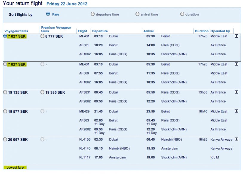 Ja, via Beirut var ju priset rätt OK, men inte via NBO. Jag tror MEA är partner till FB, så man får nog poäng, men jag vet inte om jag är så sugen på att ta en detour via Beirut den dagen. Frågan är ju vad som händer med loungeaccess, både i DXB och Beirut..?