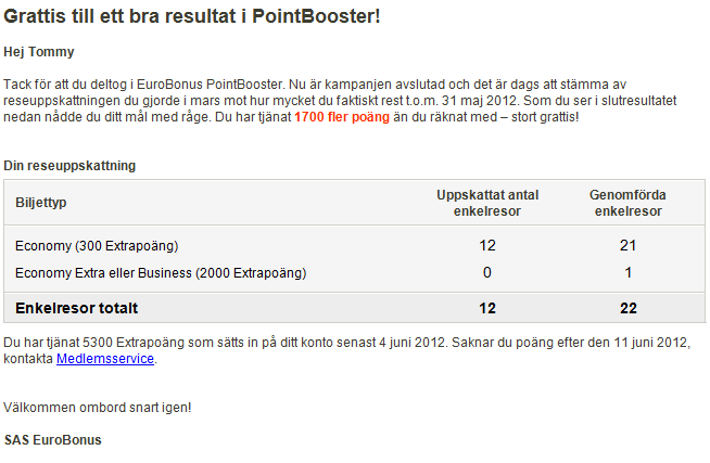 Fick mailet idag. Hade beräknat max antal flighter i economy, dvs 12. Totalt sett "överklockade" jag och gjorde 17 flighter.