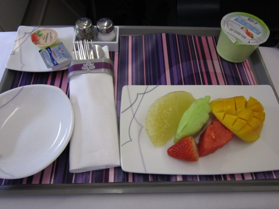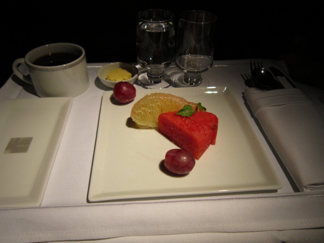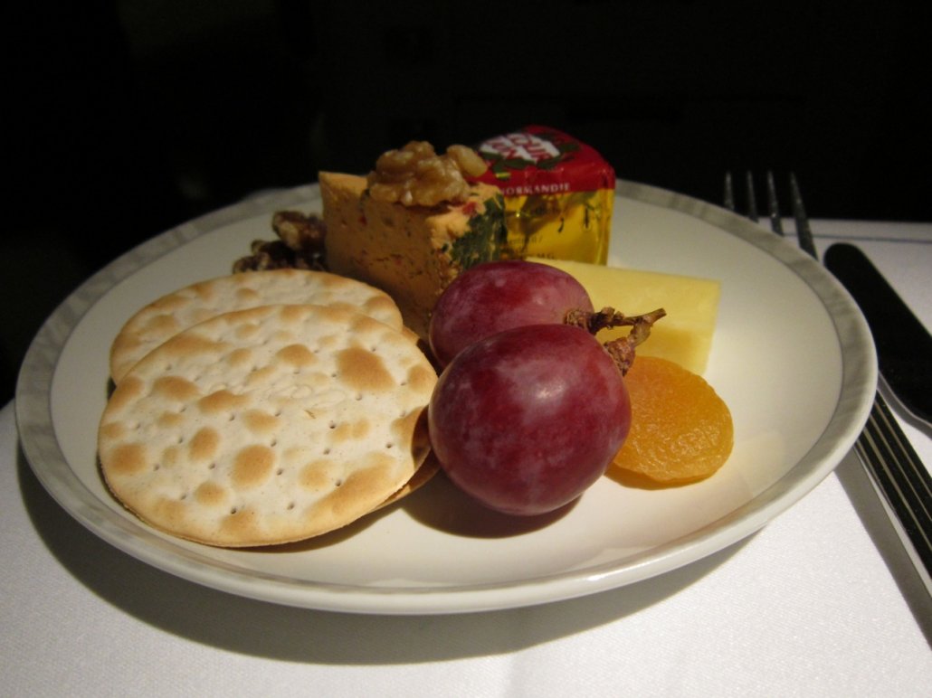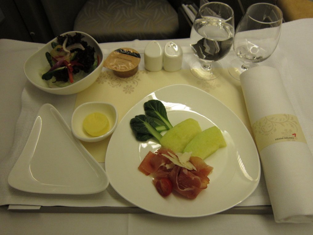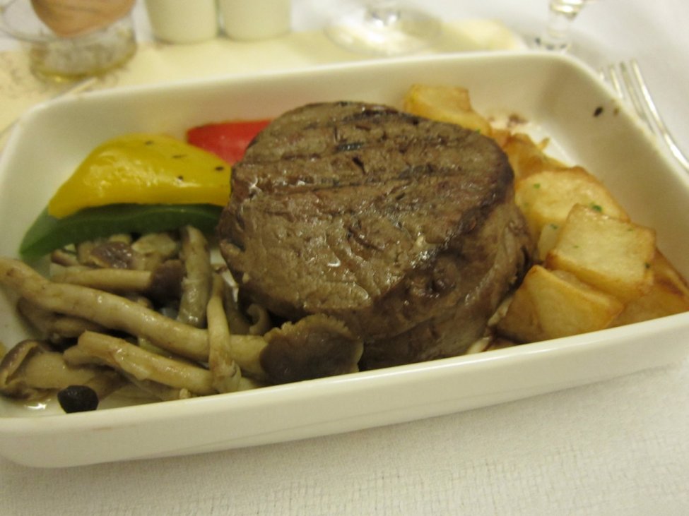 Väl uppe i luften kom ytterligare ett glas champagne samt en påse blandade nötter sedan ganska snabbt en bricka med förrätt, efterrätt. Likt flygningen ICN-HKG med Asiana hann jag knappt äta upp min förrätt innan det var dags för varmrätt. Jag förstår inte varför de skall ha så bråttom. Jag blev lite överraskad av de snabba puckarna och glömde beställa rödvin till köttet men lika bra det kanske.