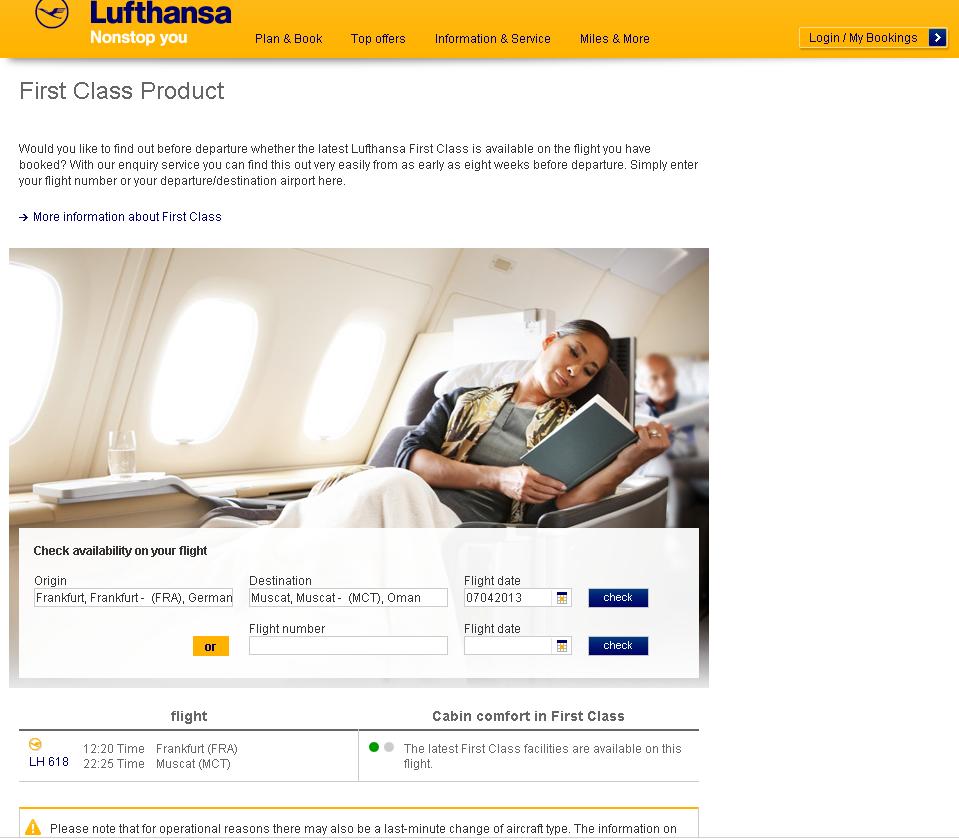 Enda chansen för mig att prova Lufthansa First är nog att åka till från FRA till mellanöstern (Muscat helst) eftersom det bara kostar 40 000 United poäng per person enkel väg. Mellanöstern är väl den kortaste resan man kan göra med Lufthansa i F? Betyder det då att Mellanöstern sist av alla kommer att få de nya sätena? Tror ni att de kommer att ha de nya sätena i december 2013?Sträckan trafikeras av Airbus A330-300.