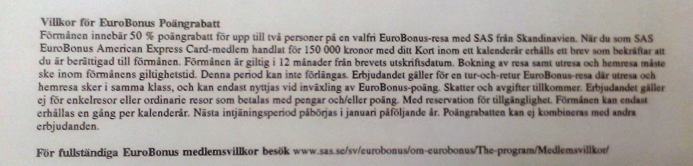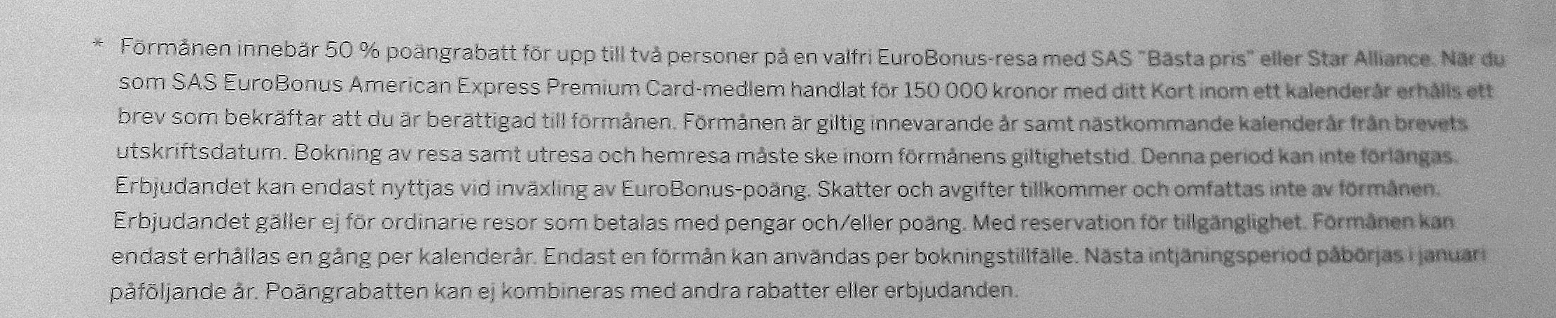 Fick hem brevet idag som informerade om ändringarna för SAS Amex. Hittar dock en mycket trevlig skrivelse för egen del vad det gäller förmånen att boka en resa med 50% rabatt för 1-2 personer.